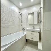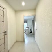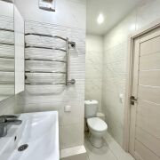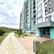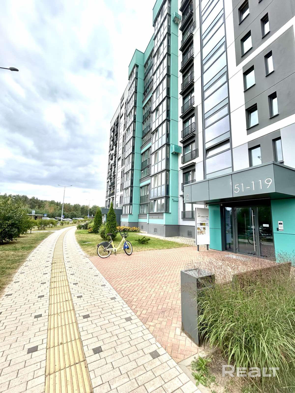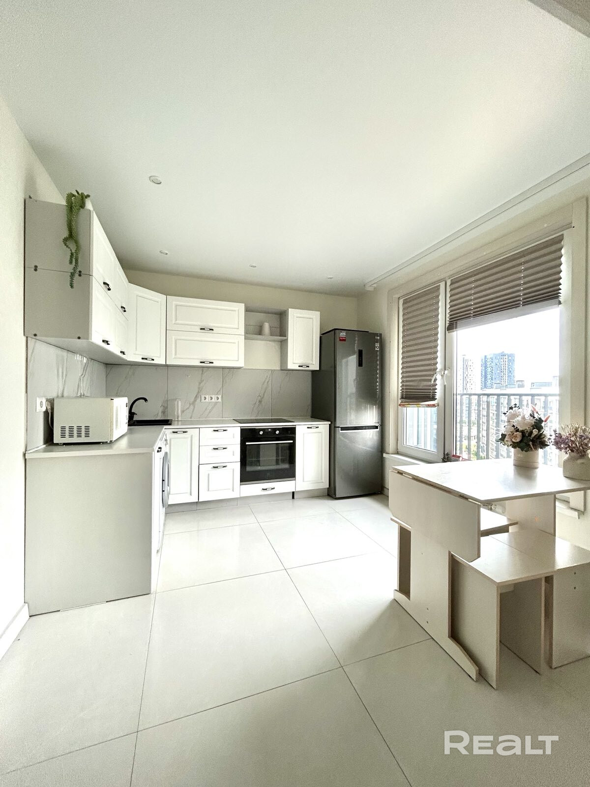 Квартира светлая с окнами в пол. Полностью укомплектована мебелью (встроенная кухня, стол с табуретами, мебель в ванной, тумба и шкаф) и бытовой техникой (холодильник, варочная поверхность, духовой шкаф, посудомоечная машина, вытяжка, микроволновая печь, стиральная машина).