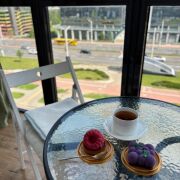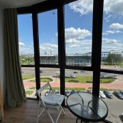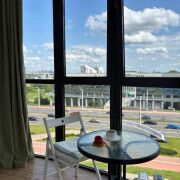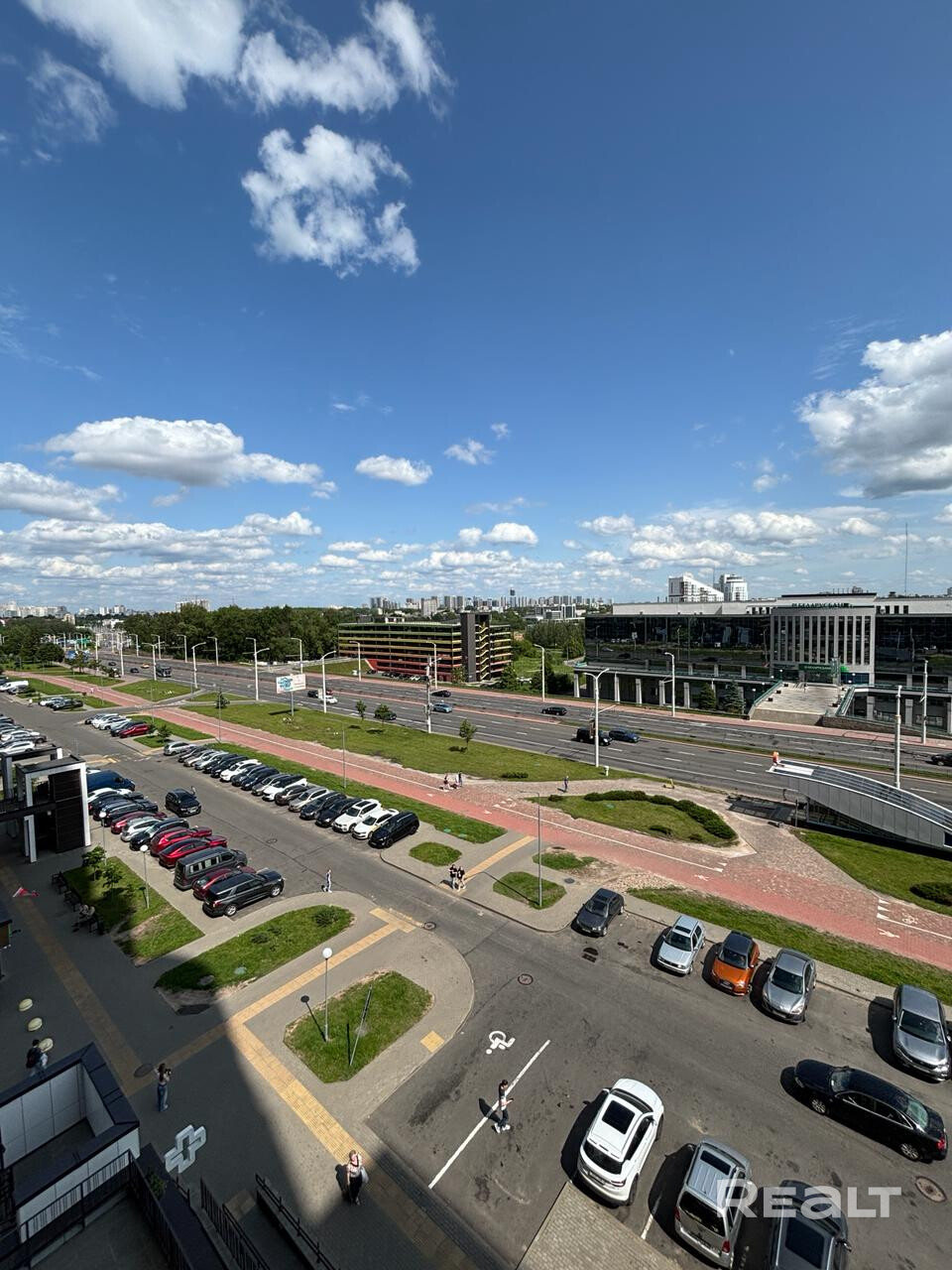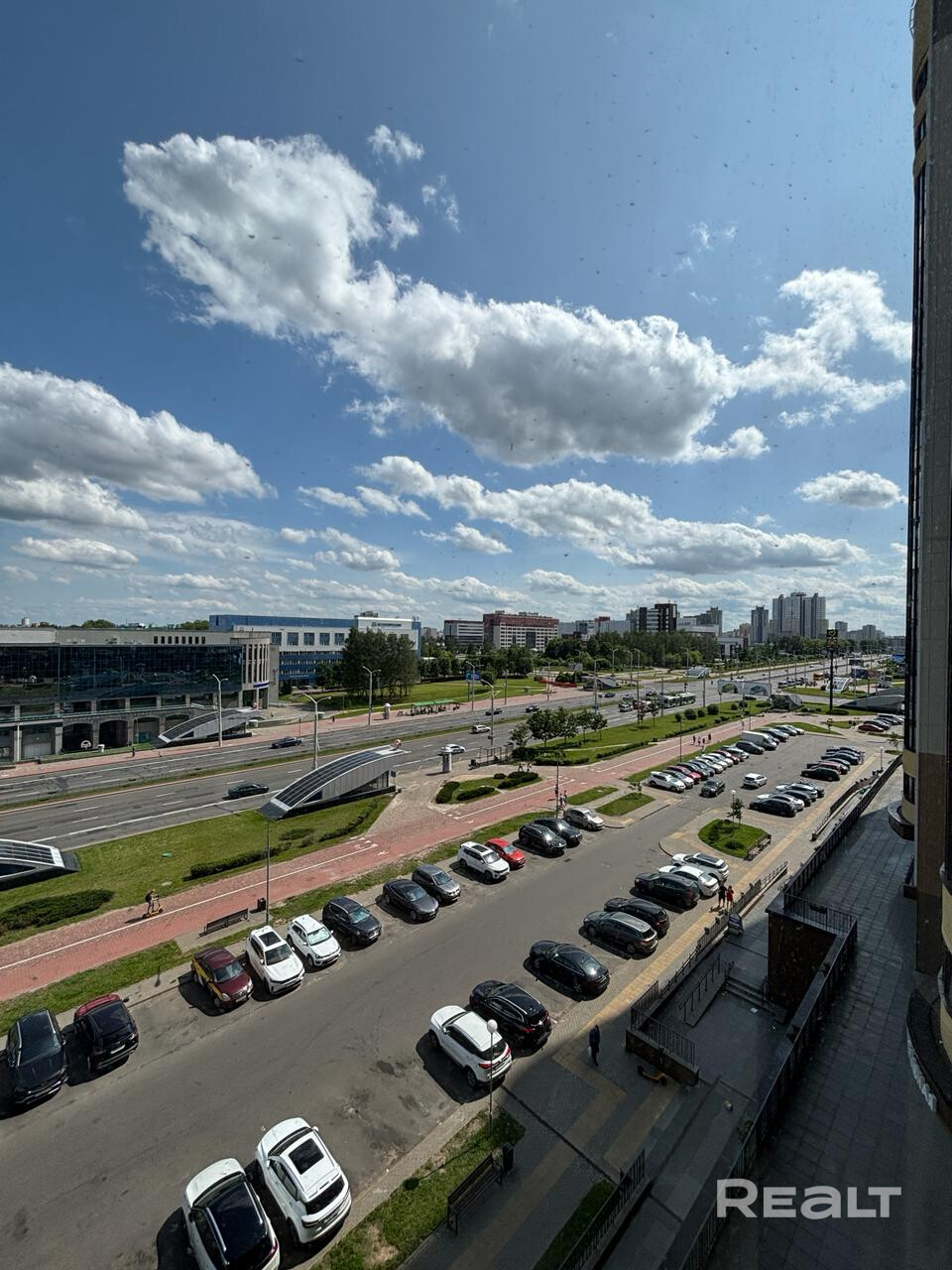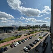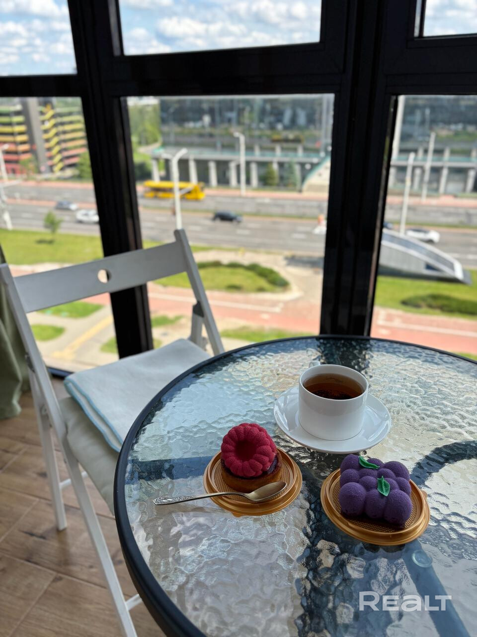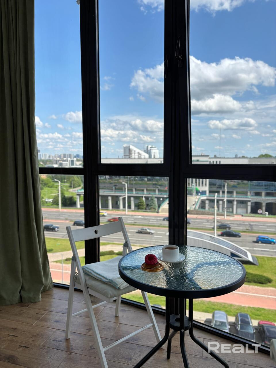 На лоджии окна в пол, отлично подходит для кофе- и чаепития, летом можно завтракать и ужинать. Красивый вид на проспект, высотки Минск Мира и Малиновку.