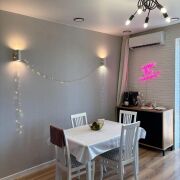 Много сценариев освещения от яркого до теплого вечернего приглушенного, неоновая вывеска. Хорошая звукоизоляция, тихие соседи.