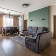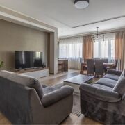 Квартира полностью готова для проживания. Грамотная планировка состоит из просторной гостиной с кухней, отдельной спальни с проходной гардеробной, ванной комнаты, лоджии. Высота потолков 3 метра. Закрытый двор с ландшафтным дизайном и фонтанами только для жильцов комплекса. Плоскостной и подземный паркинг для авто. Полностью охраняемая территория с круглосуточным видеонаблюдением. Въезд на территорию комплекса только через шлагбаум.