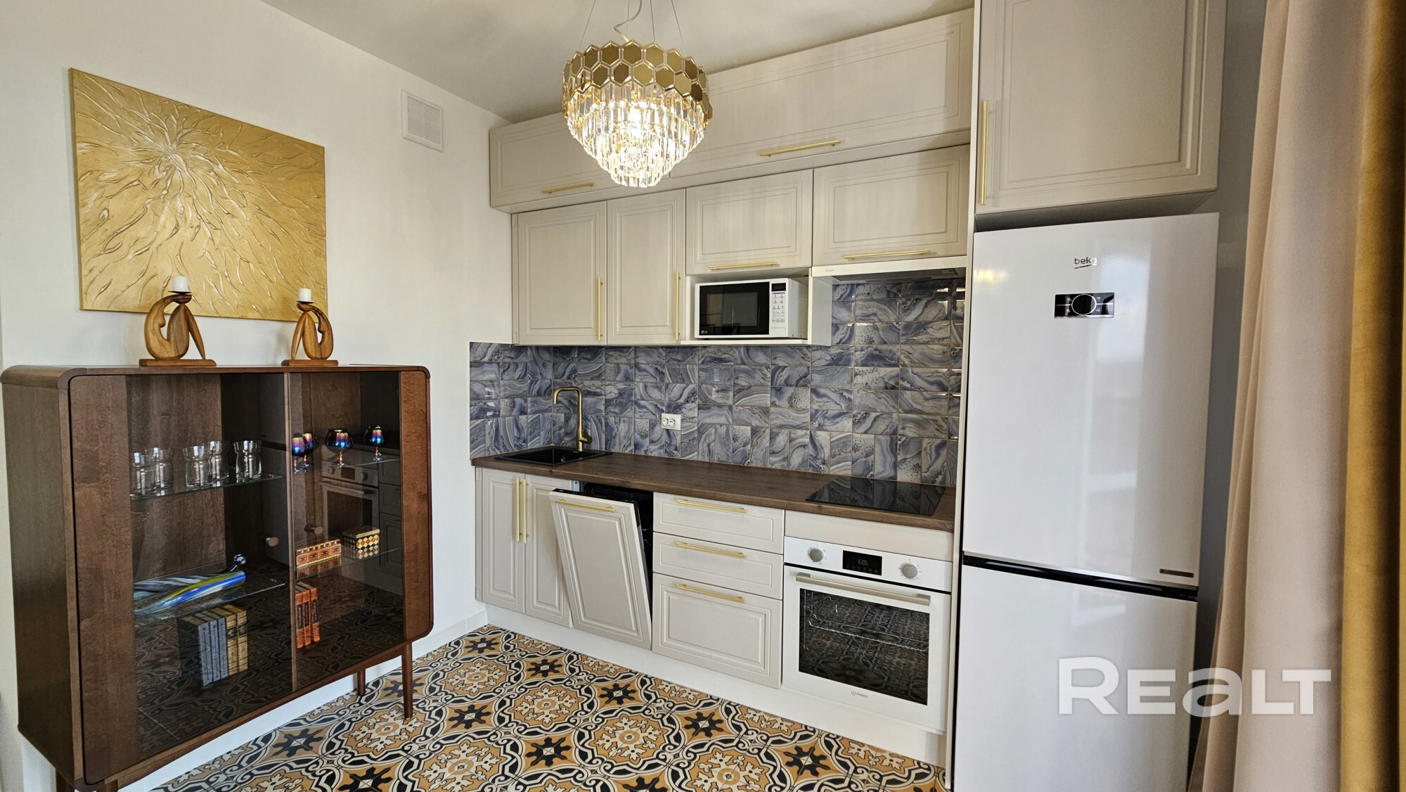 Бытовая техника: посудомоечная машина, варочная индукционная панель, микроволновая печь, духовой шкаф, вытяжка, стиральная машина, холодильник, бойлер. Интернет есть возможность подключить. Есть 2 вместительных шкафа. Сан. узел совмещённый: корпусная мебель, зеркало с подсветкой, унитаз, ванна.