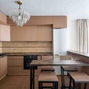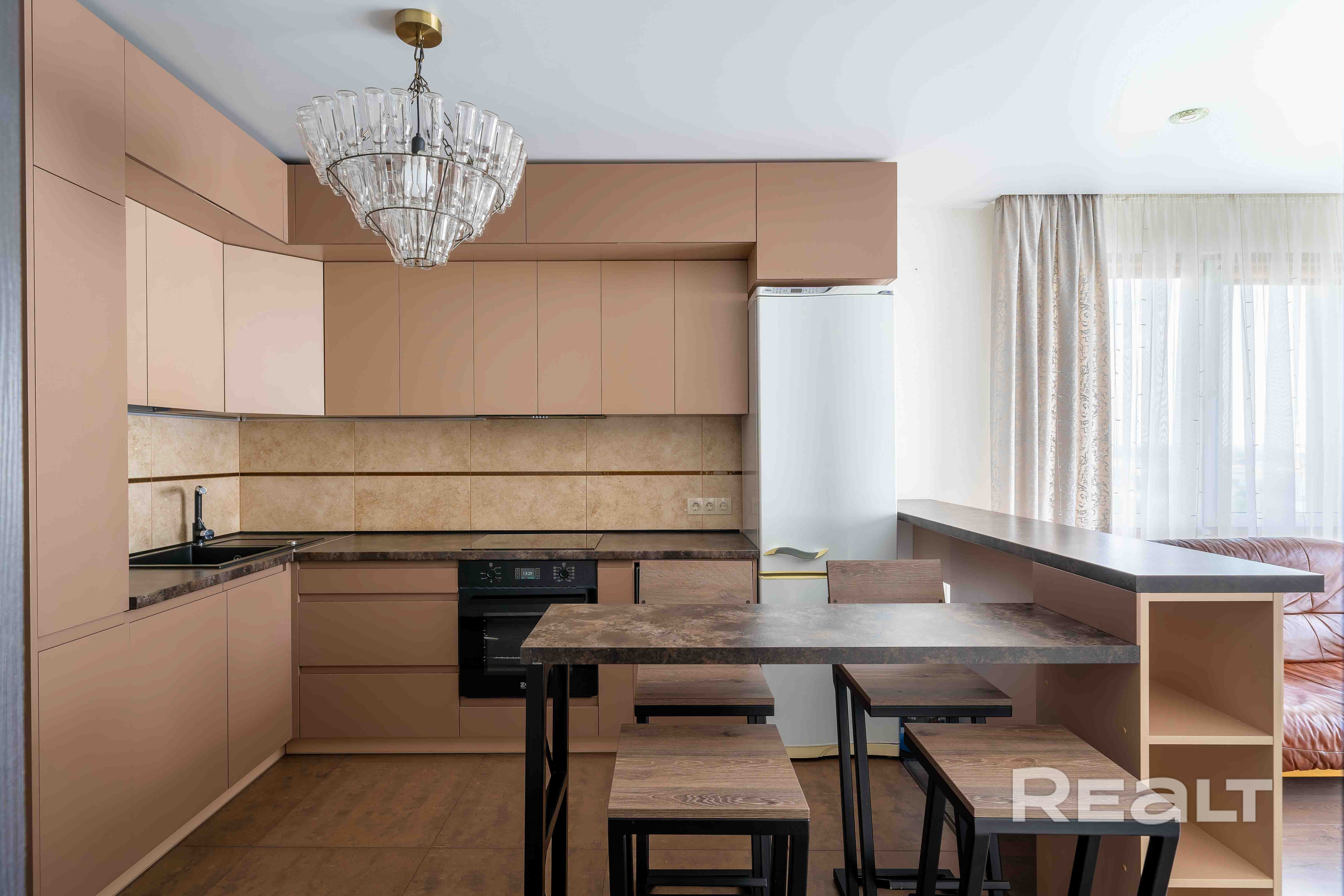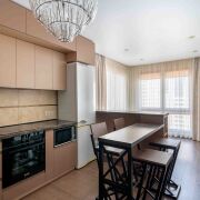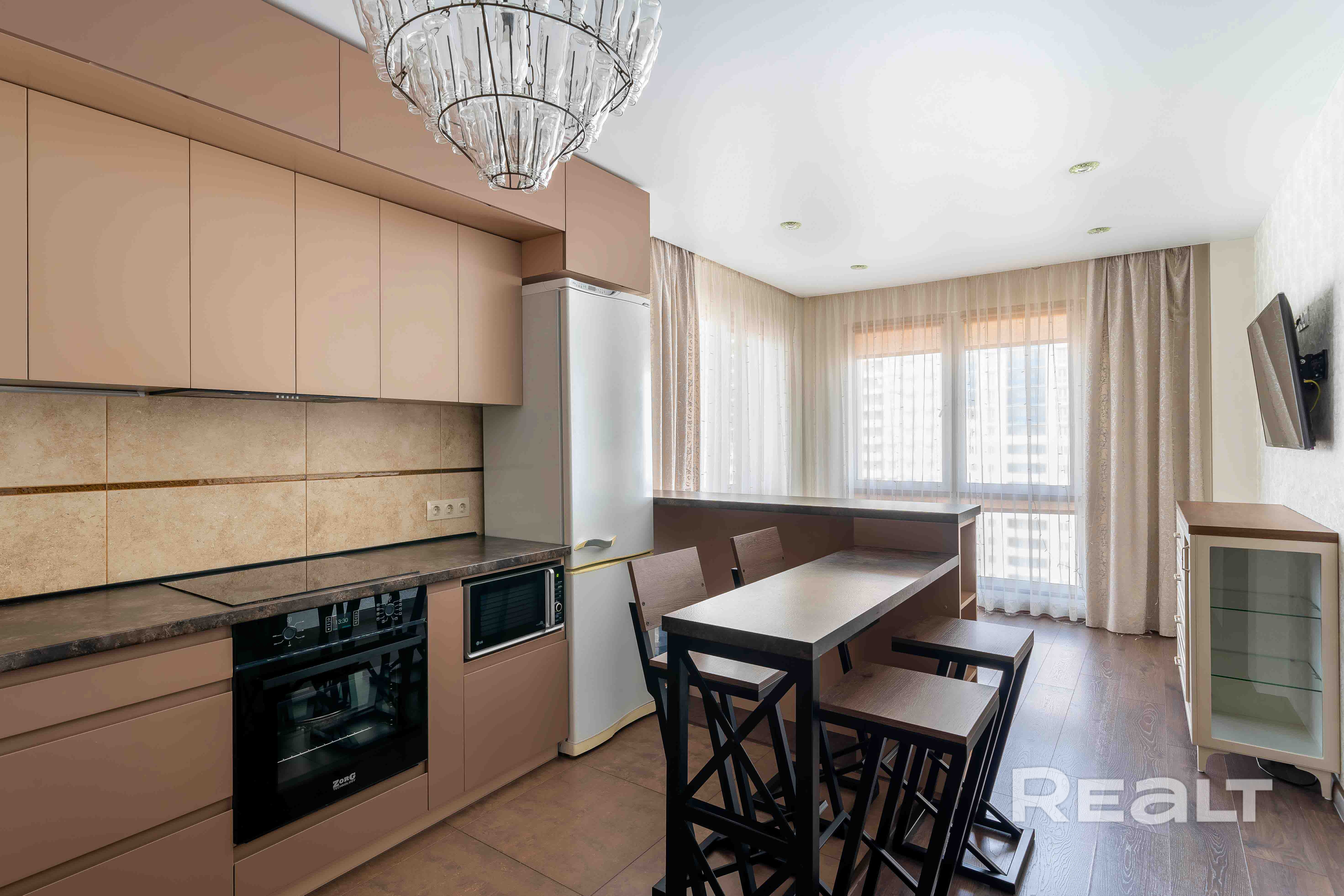 На кухне установлены: варочная панель, духовой шкаф, посудомойка, микроволновая печь, холодильник.