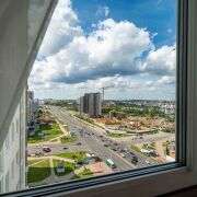 Сдается евротрешка у метро Грушевка. 70 квадратных метров. 2 изолированные комнаты, кухня-гостиная с панорамным видом на проспект Дзержинского.