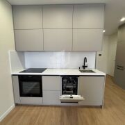 Вся техника — варочная панель, духовой шкаф, посудомоечная машина, холодильник и сушильно-стиральная машина — в комплекте.