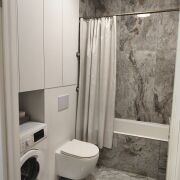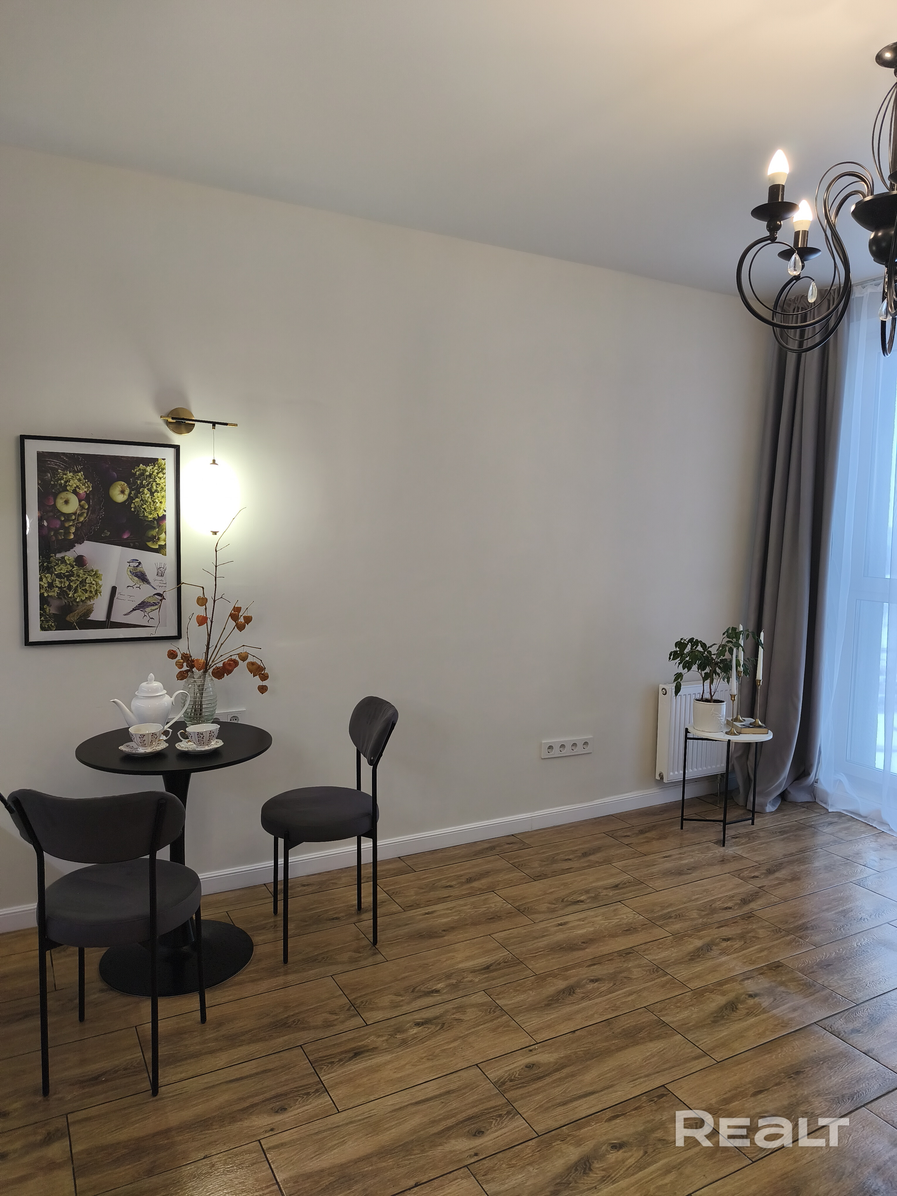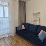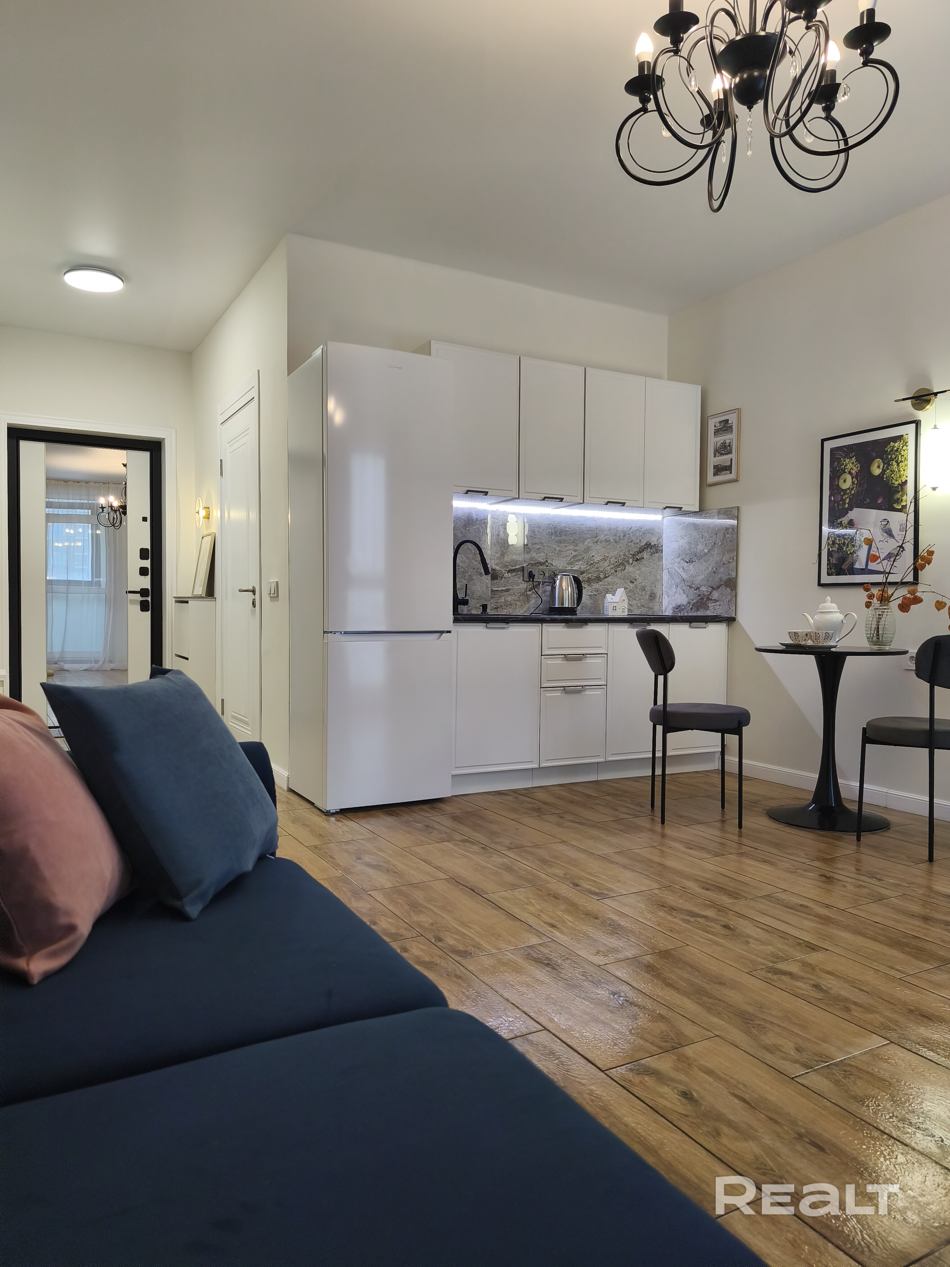 Однокомнатная студия, первое заселение. Диван,плита, микроволновка, стиральная машина. Есть большая парковка возле дома, теннисная и баскетбольные площадки. Велосипедная и колясочные в доме.