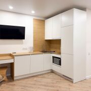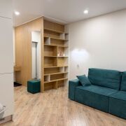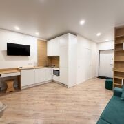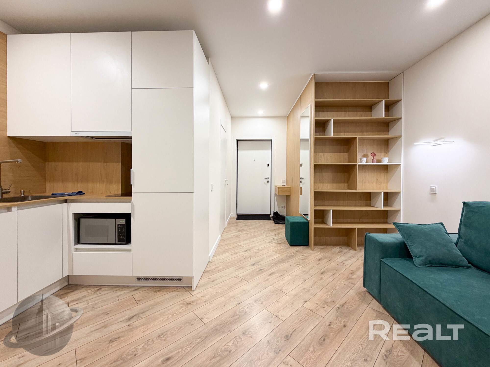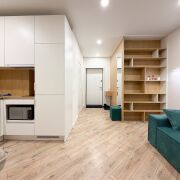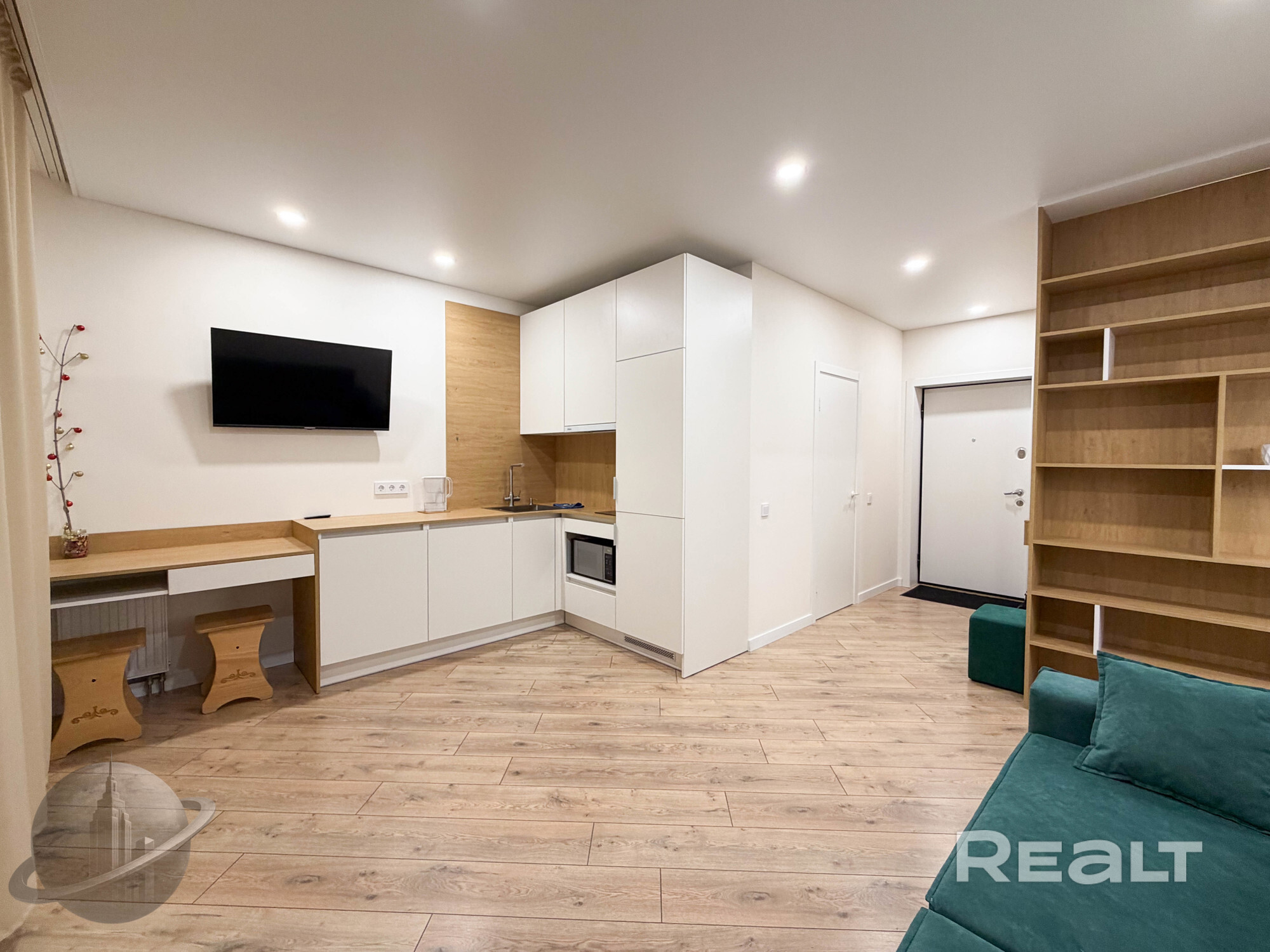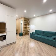 Квартира готова к проживанию. Студия с удобным раскладным диваном объединена с функциональной кухней с полным набором техники (СВЧ, варочная поверхность, холодильник, телевизор, стиральная машина).
