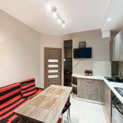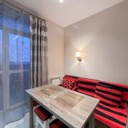 - На кухне есть диван (раскладывается), обеденный стол, много естественного света
