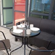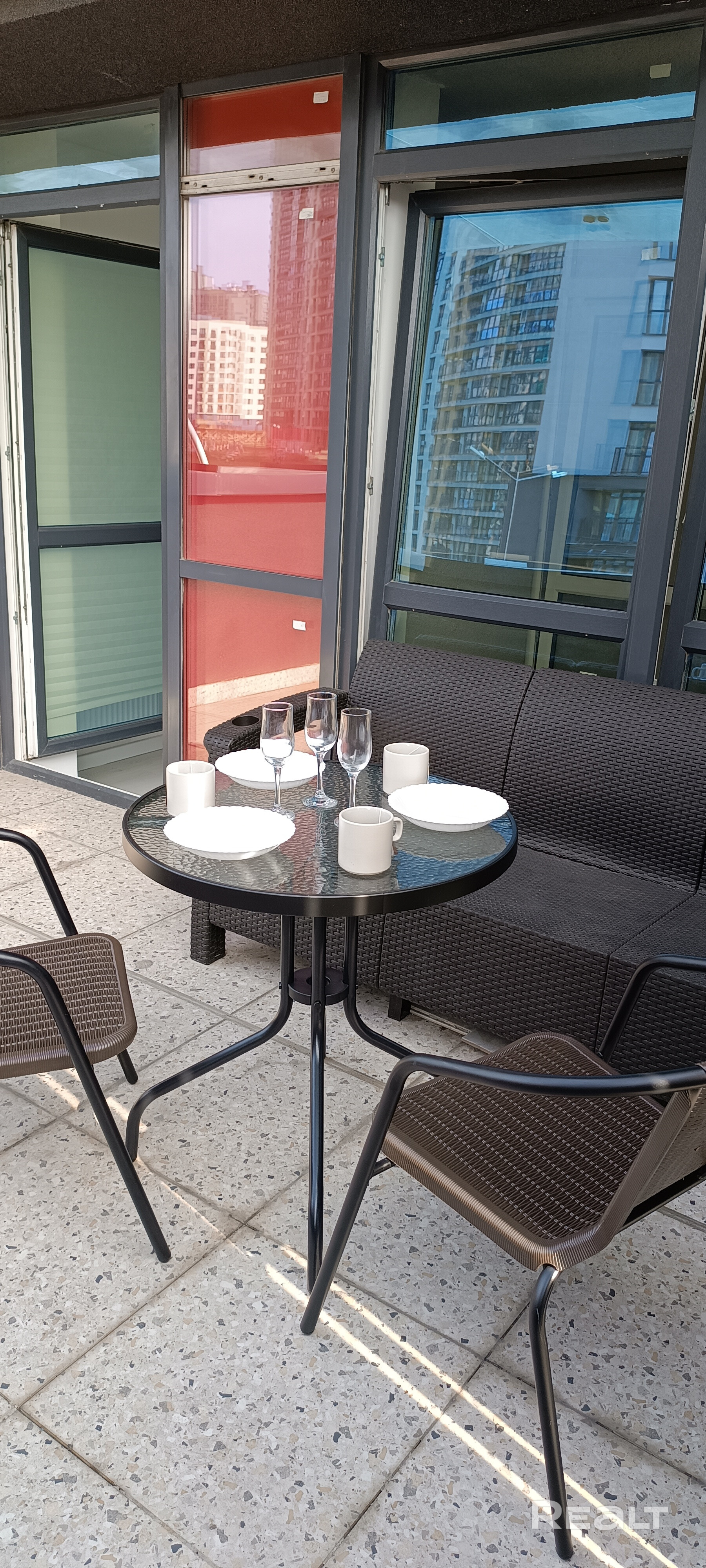 Сдается квартира-студия в современном жилом комплексе. Ремонт выполнен в светлых тонах. Квартира оснащена бытовой техникой: холодильником, стиральной машиной, свч-печью, телевизором, электрическим чайником. В квартире есть просторная терраса, оснащённая садовой мебелью.