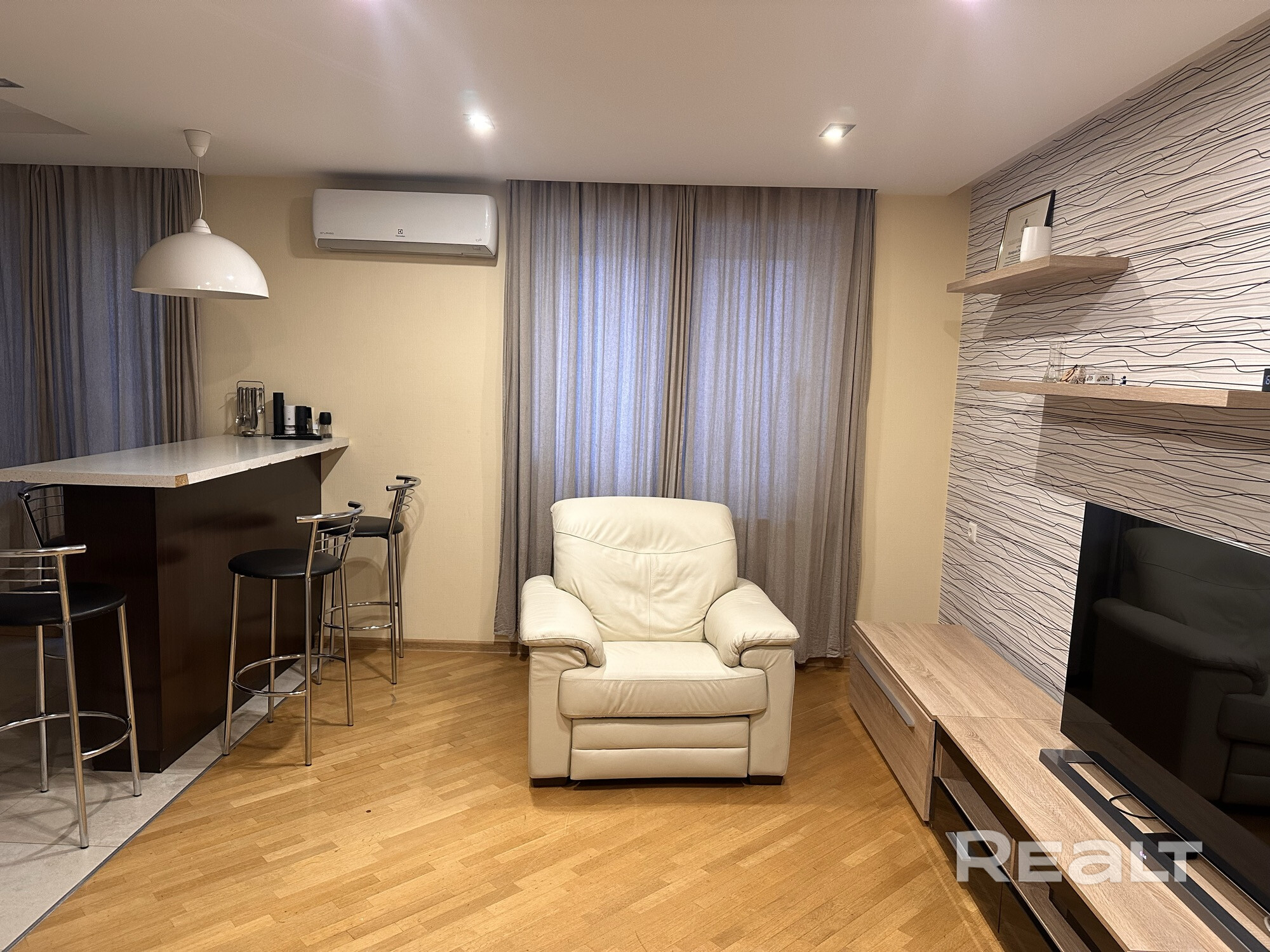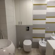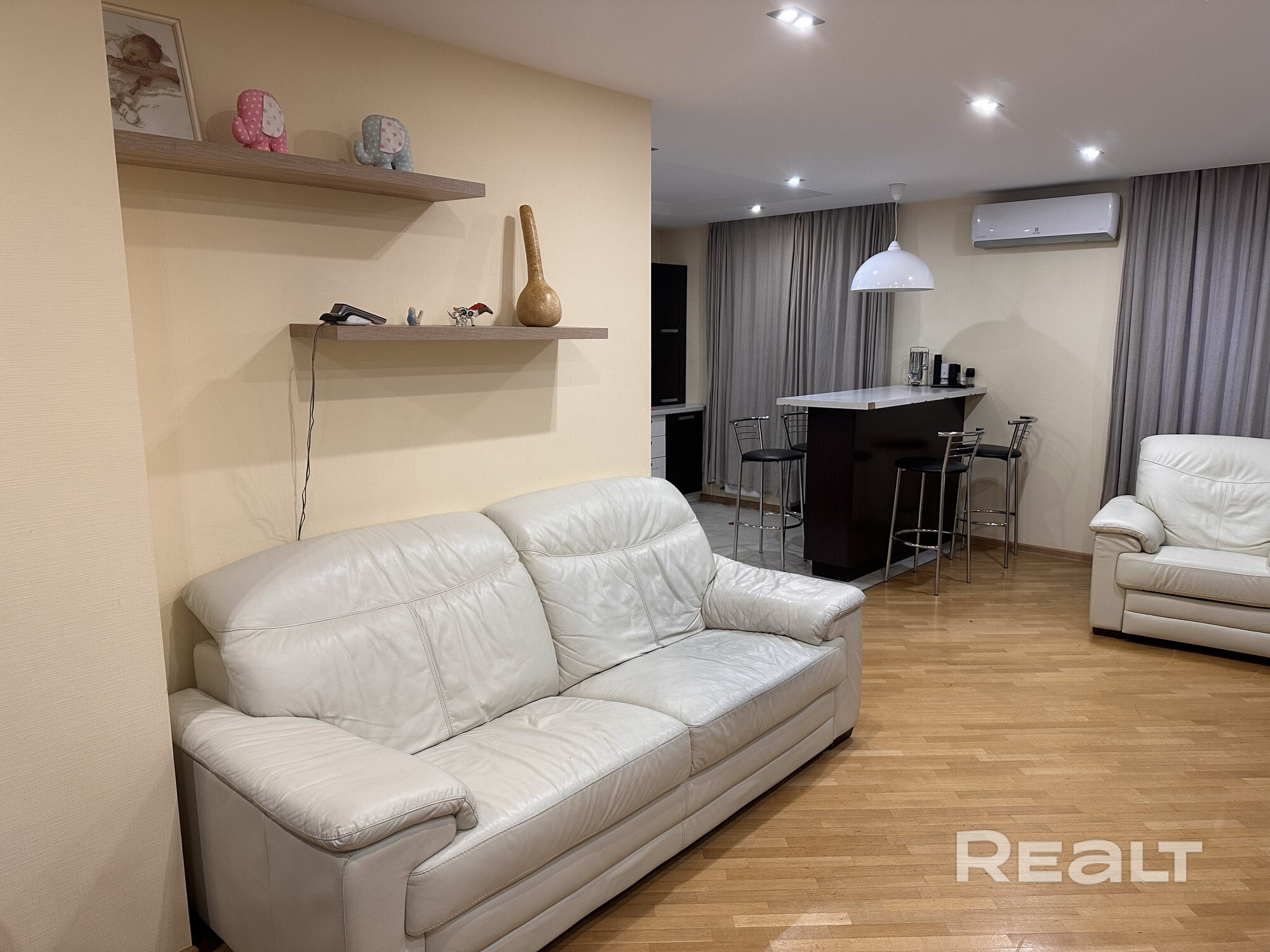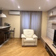 Квартира с дизайнерским ремонтом и качественными материалами: • Сантехника Grohe и Disegno Ceramica • Пол — дубовый паркет • Во всех комнатах установлены кондиционеры Оснащение квартиры: • Телевизоры в комнатах • Посудомоечная машина Bosch • Стиральная и сушильная машины Bosch • Холодильник Liebherr с морозильной камерой • Кожаный диван и кресло-реклайнер, как в кинотеатре. • Бойлер. • Кофемашина Delonghi • Высокоскоростной интернет • Сигнализация