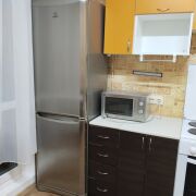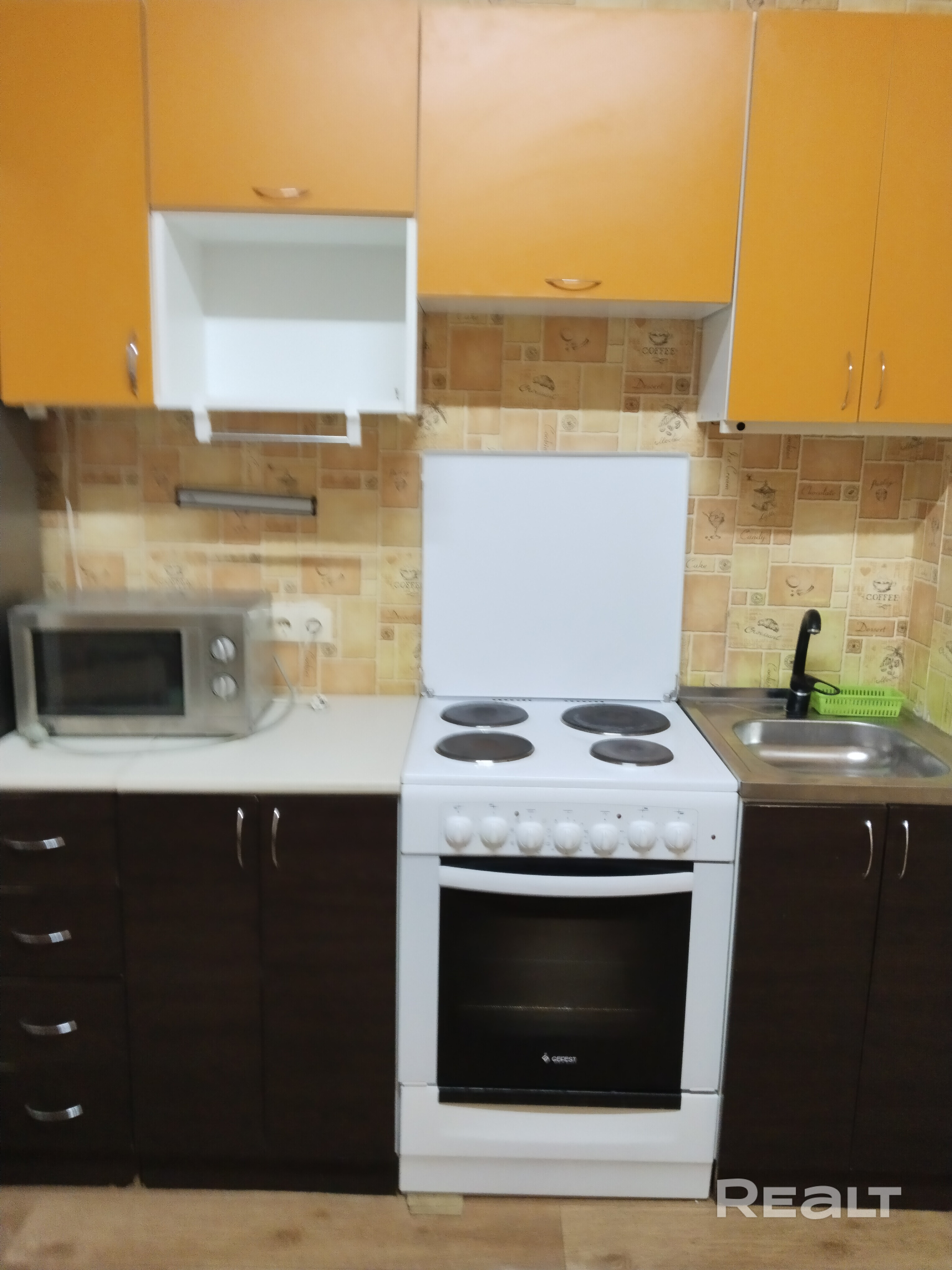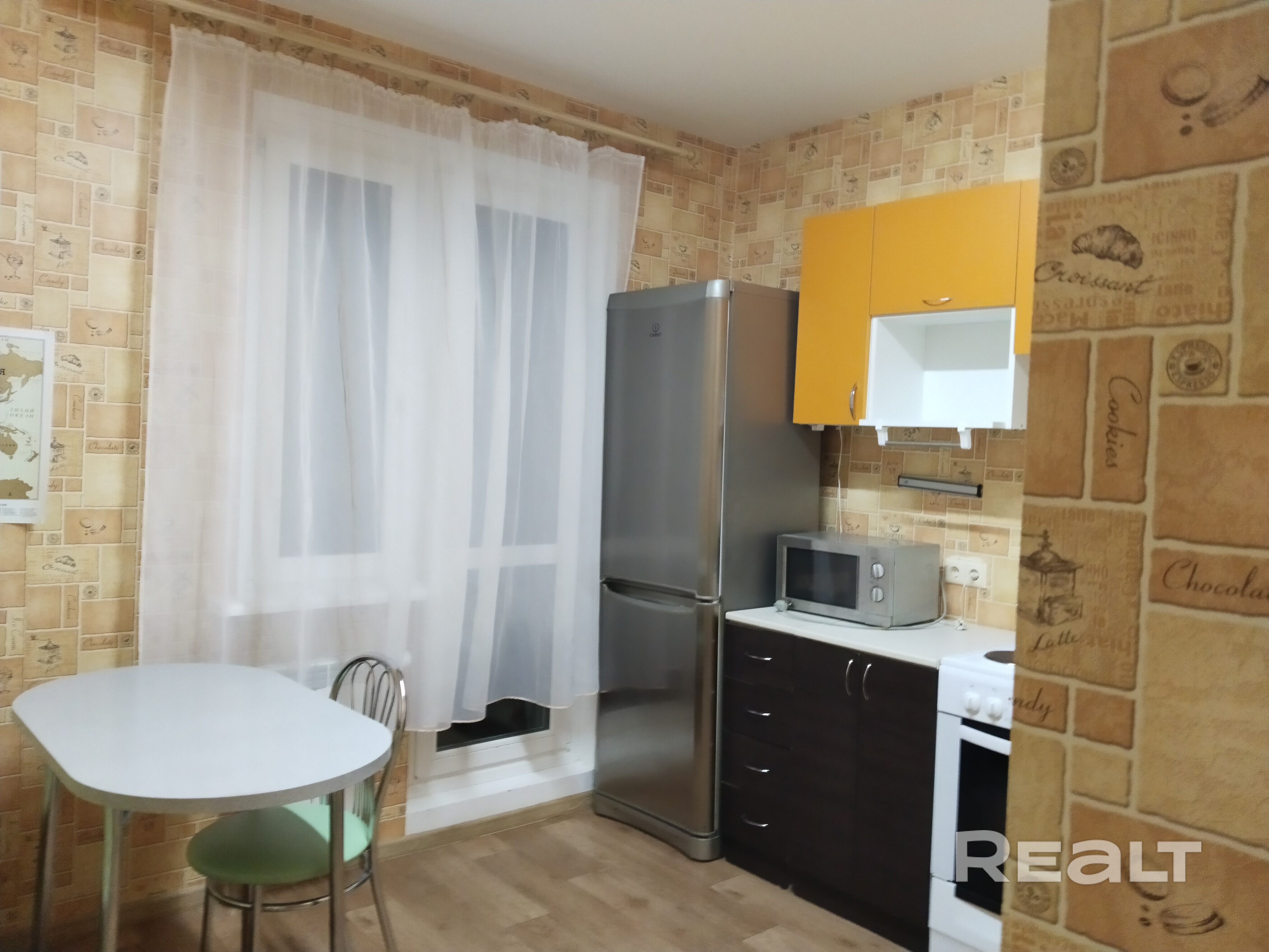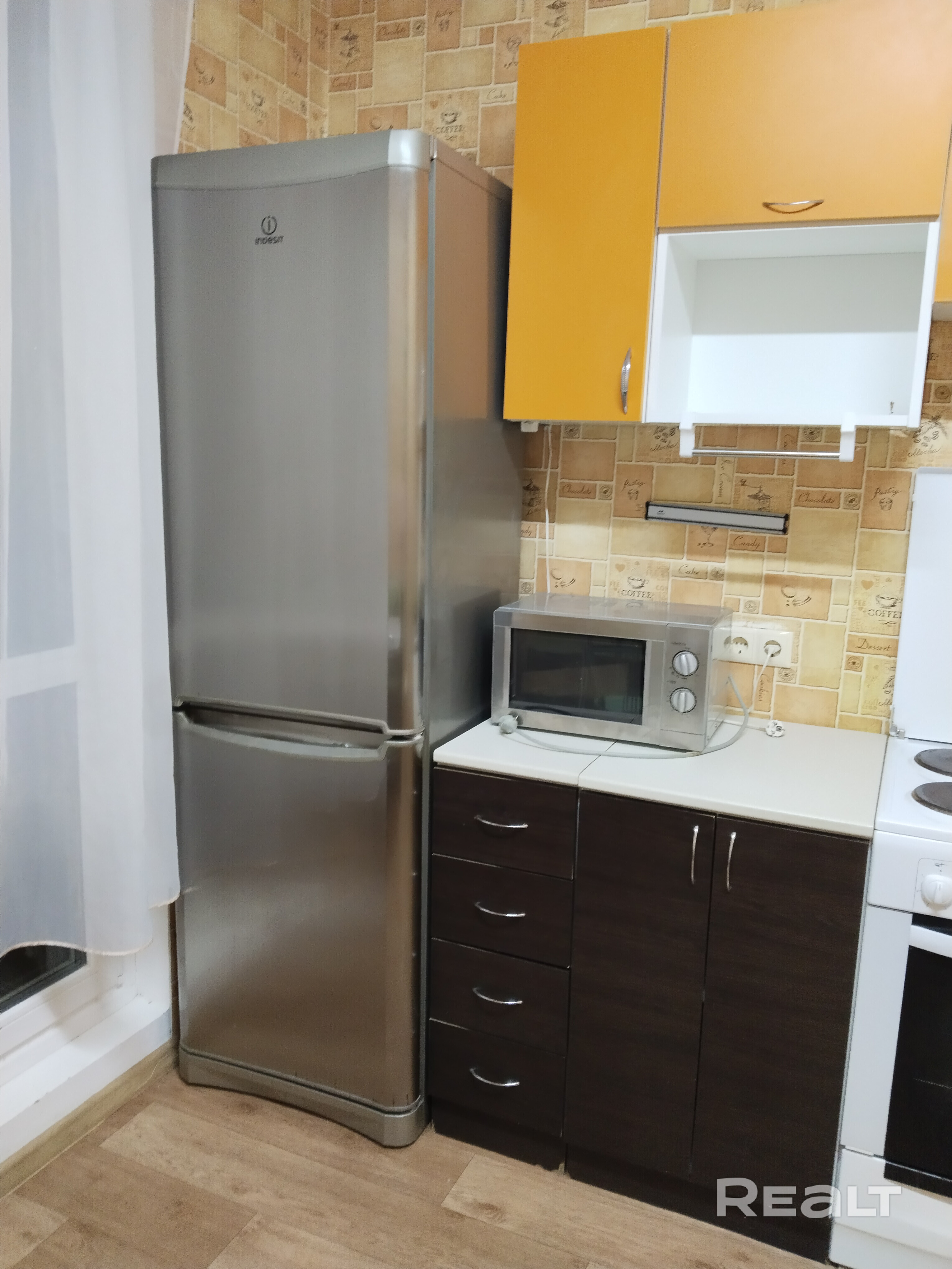 Квартира однокомнатная на длительный срок.. Первомайский район, Уручье. 11 этаж, есть грузовой лифт. Кухонный гарнитур,, холодильник, печь СВЧ. В комнате угловой диван.