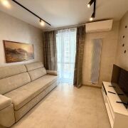 В квартире выполнен качественный евроремонт, первая сдача. Планировка продумана до мелочей: две отдельные гардеробные комнаты, установлены два кондиционера. Квартира полностью оборудована современной бытовой техникой и готова к заселению. Низкие коммунальные платежи.