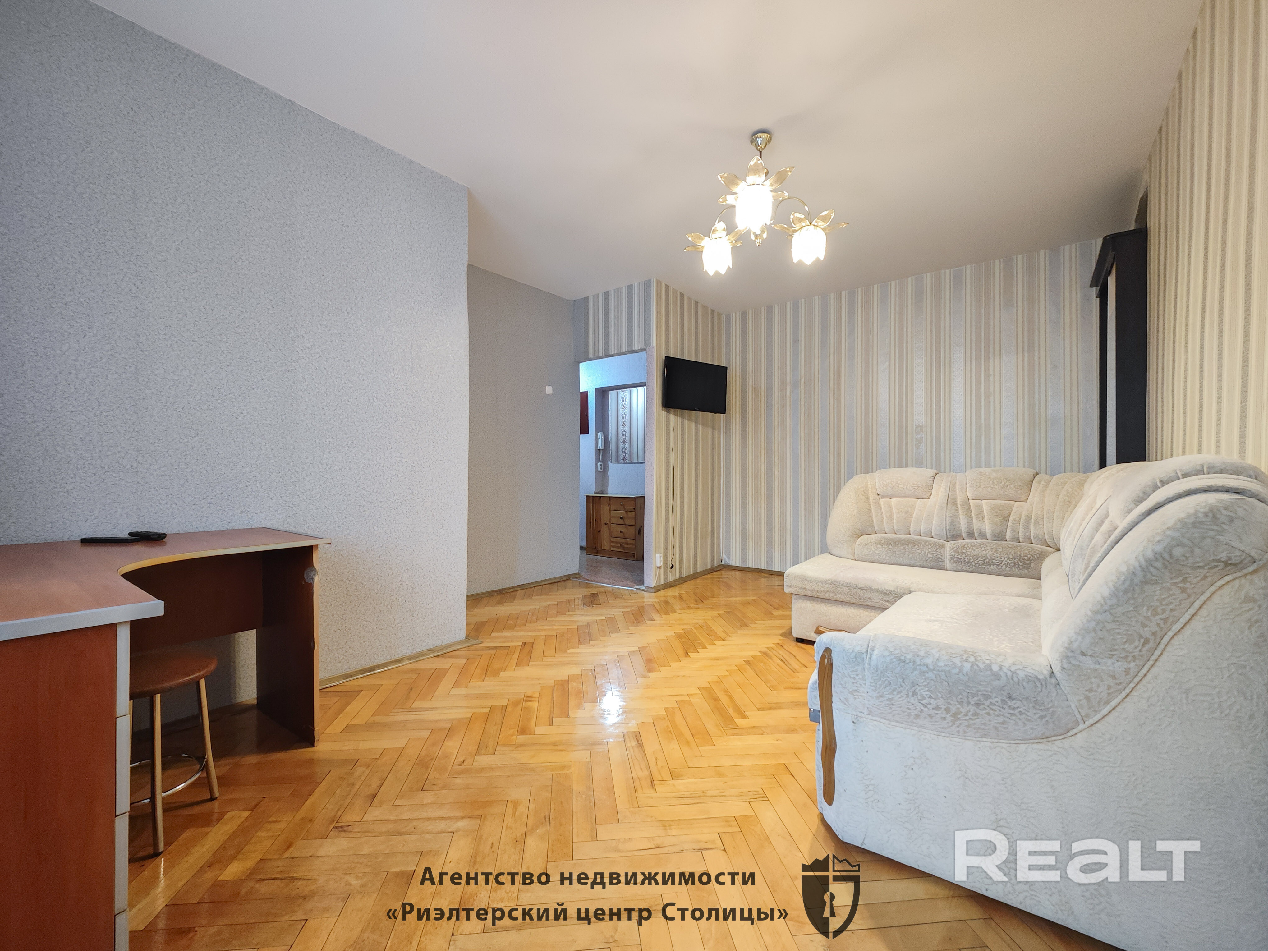 Полностью укомплектована необходимой мебелью и техникой, в комнате паркетный пол, есть застеклённый балкон.