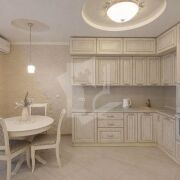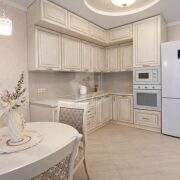 Просторная кухня с мебелью из массива в светлом оттенке полностью укомплектована современной встроенной техникой. Удобная рабочая зона, духовой шкаф, микроволновая печь, вместительный холодильник — все для комфортной жизни. Обеденная зона с круглым столом идеально подойдет как для уютных завтраков, так и для вечерних встреч. Мягкое освещение и декоративные элементы создают атмосферу уюта и тепла.