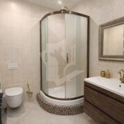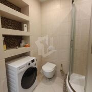 Современный санузел с душевой кабиной, качественной сантехникой и стиральной машиной. Использованы износостойкие материалы, продуманы места для хранения — практично и эстетично.