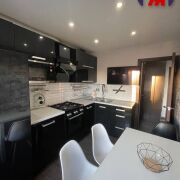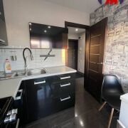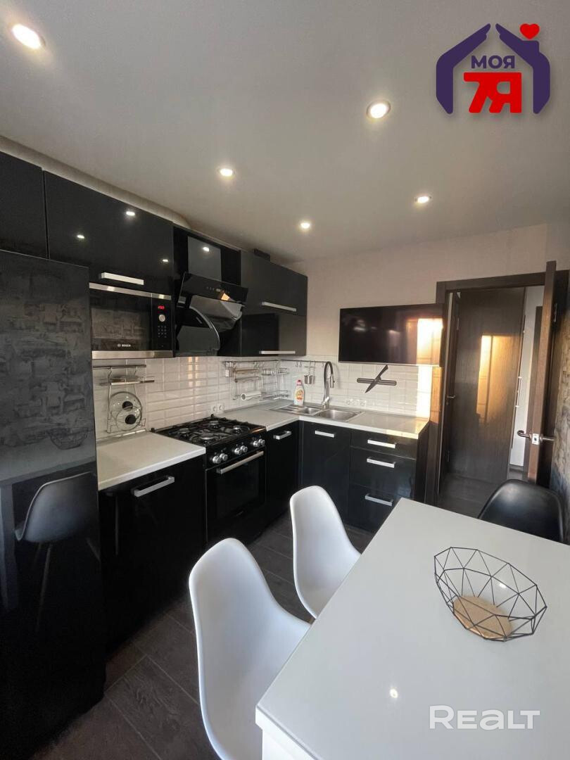 -Большая кухня почти 8 кв.м со стильным кухонным гарнитуром и полноценной рабочей поверхностью. Кухня укомплектована бытовой техникой, пространство выглядит аккуратно и современно.