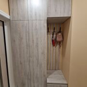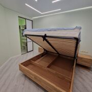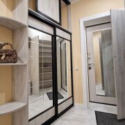 В спальне большая двуспальная кровать с ортопедическим матрасом. Также в спальной комнате расположена отдельная гардеробная. В квартире очень много мест для хранения вещей.