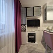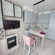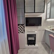 Кухня-гостинная оснащена: духовой шкаф, варочная панель, электрокамин, телевизор, электрочайник и т.д.