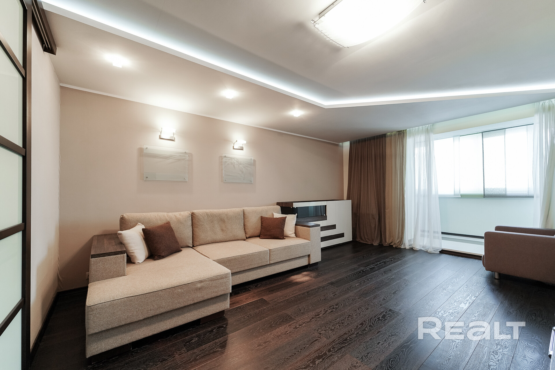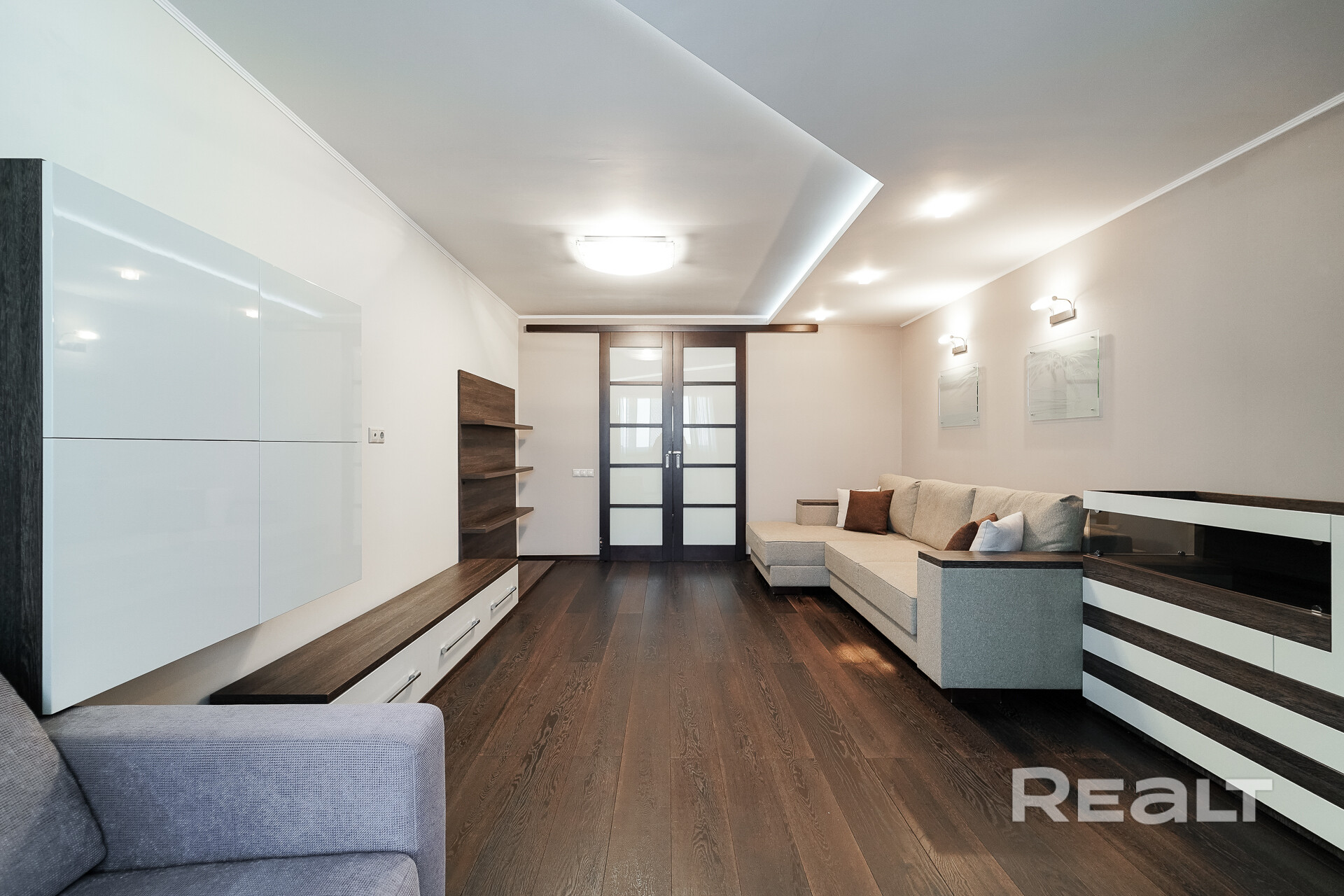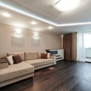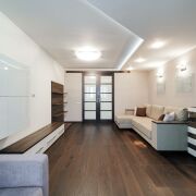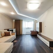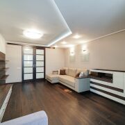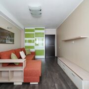 Гостиная: площадью 23.2 м2 – пространство  подходит для семейных и дружеских посиделок после тяжелого рабочего дня. На полу паркет, на стенах обои, потолок гипсокартон. Установлен диван и места для хранения. Имеется возможность разместить ТВ зону. Из гостиной имеется выход на балкон, оборудованный под рабочее место.