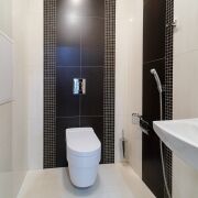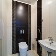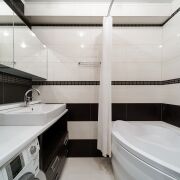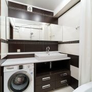 Санузел: раздельный. Полноценная ванна и туалет, в плитке. В туалете установлена инсталляция, умывальник, гигиенический душ. В ванне имеется стиральная машина, ванна с режимом джакузи, умывальник и места для хранения.