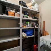 Кладовая: 3.4 м2. Размещена сушильная машина и стеллажи для хранения. Пространство позволяет спрятать всё лишнее или организовать построчную зону.