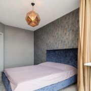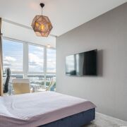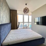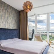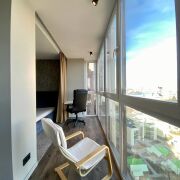 В квартире есть вместительная гардеробная, рабочее место. Лоджия вынесена в зону спальни и открывается шикарный вид на город.