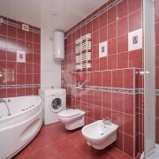 Санузел просторный и полностью оборудован: угловая ванна, душевая кабина, биде.