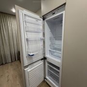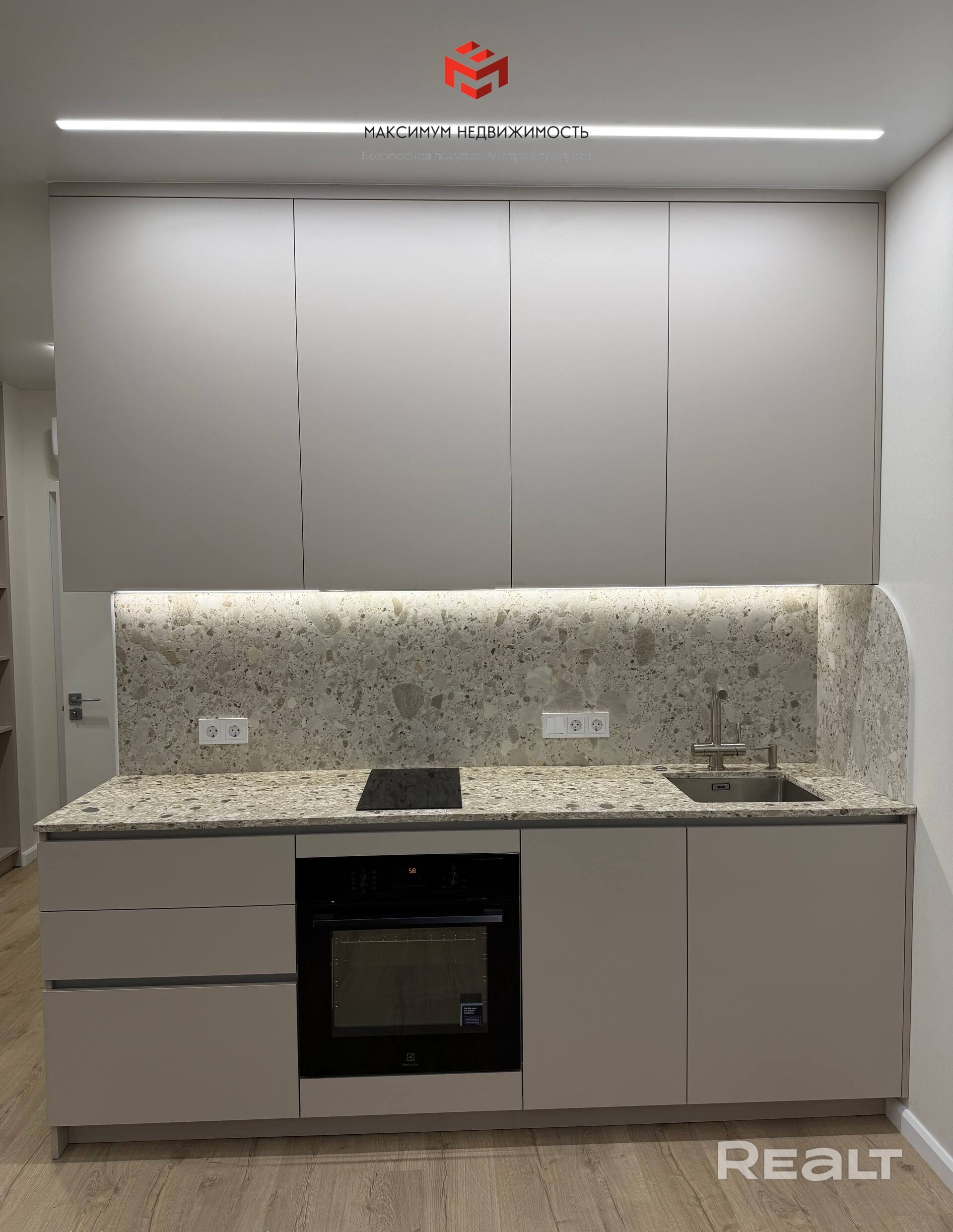Квартира укомплектована всей мебелью и техникой: стильная встроенная кухня, индукционная варочная поверхность и духовой шкаф Electrolux, встроенный холодильник, посудомоечная машина Electrolux, вытяжка, печь свч, электрочайник.