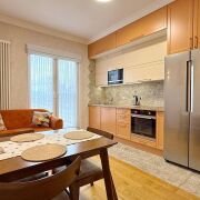 Встроенная кухня с доводчиками и техникой (духовой шкаф, варочная поверхность, посудомоечная машинка, СВЧ и холодильник).
