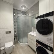 Раздельный санузел облицован керамогранитом, установлена инсталляция, подвесной унитаз, гигиенический душ, душевая кабина, напольная тумба с доводчиками и накладной раковиной, зеркало, стиральная машина и сушка для белья, бойлер.