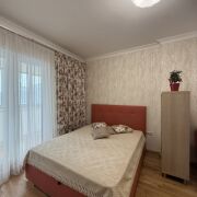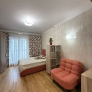 Так же в комнате есть большая двухспальная кровать, шкаф, комод, телевизор, кресло. На балконе обустроено рабочее место.