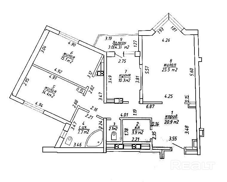 Три раздельные комнаты, просторная кухня, большой сан узел, гардеробная и застекленная лоджия.