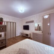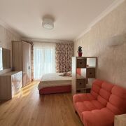Так же в комнате есть большая двухспальная кровать, шкаф, комод, телевизор, кресло. На балконе обустроено рабочее место.