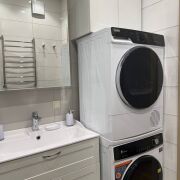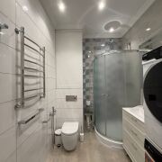 Санузел облицован плиткой, установлена инсталляция, подвесной унитаз, гигиенический душ, душевая кабина, напольная тумба с доводчиками и накладной раковиной, зеркало, стиральная машина и сушка для белья, бойлер, фен для волос.