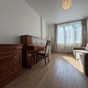 - Вторая комната 17,5 м2: пианино (Германия), диван‑книга, книжный шкаф, стеллажи для хранения, кожаное кресло.