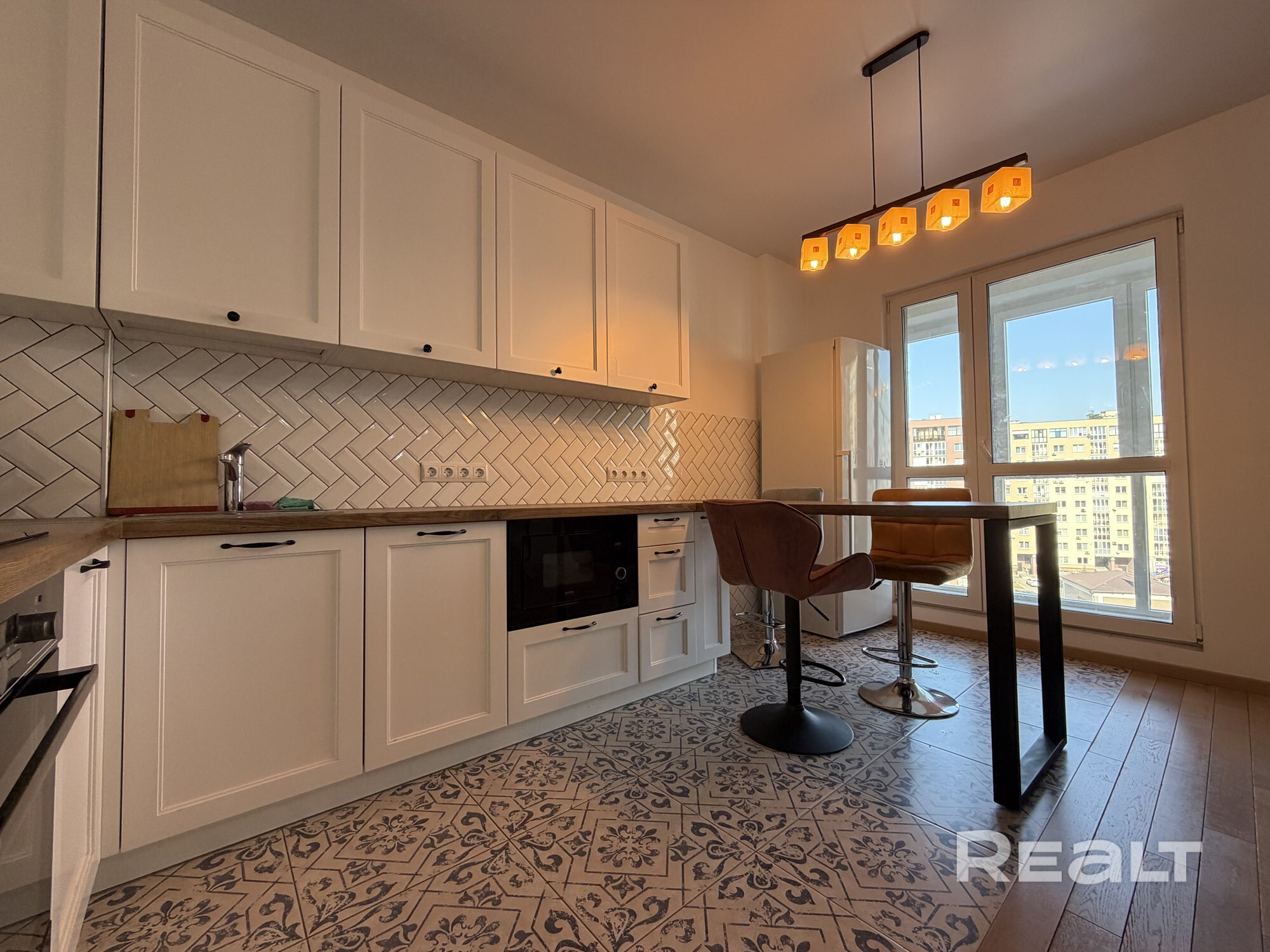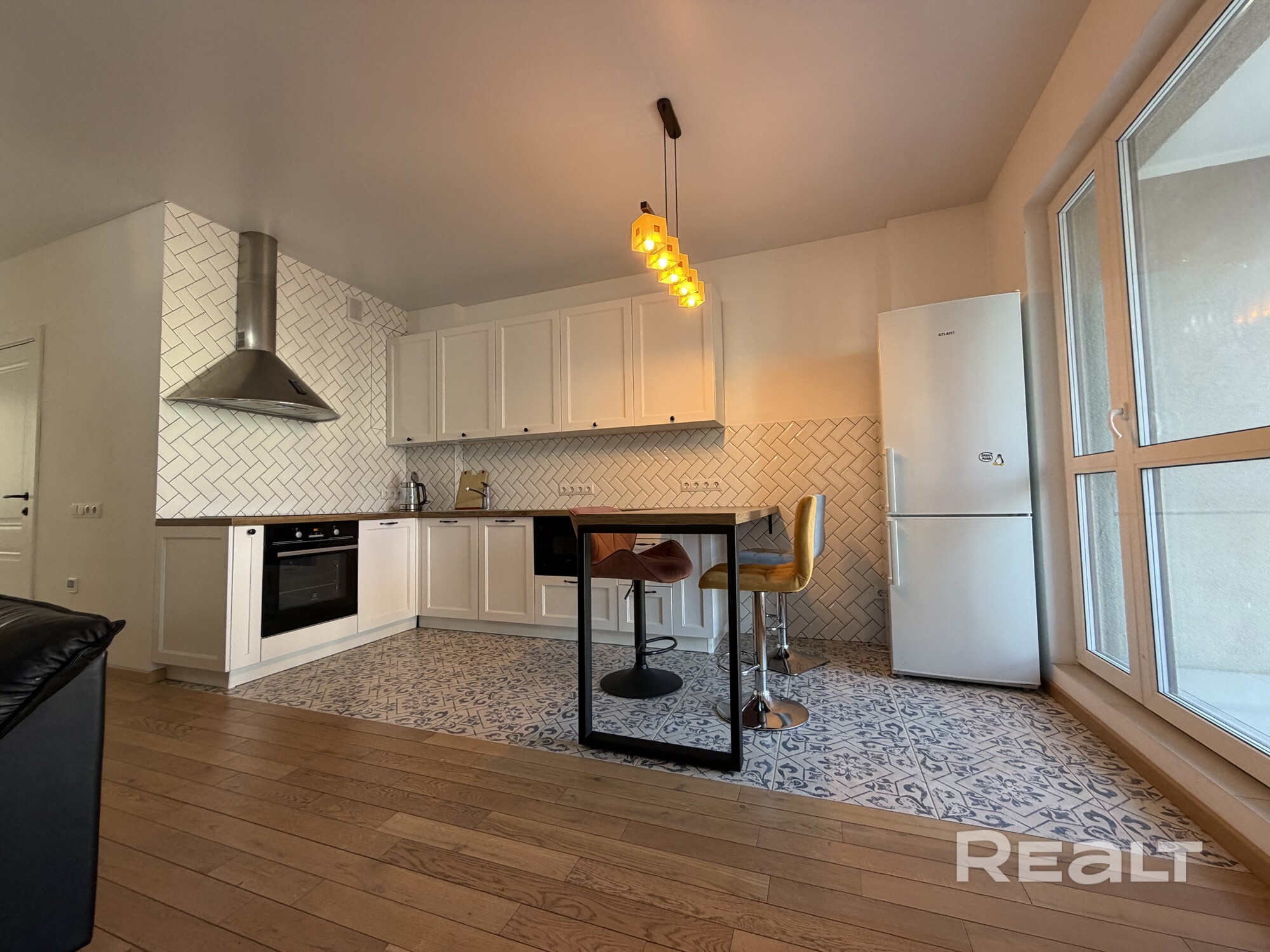- Полы: дубовая доска и керамическая плитка; в зоне кухни и ванной — тёплые полы.