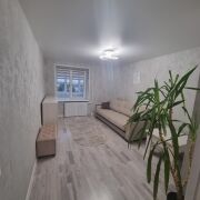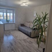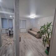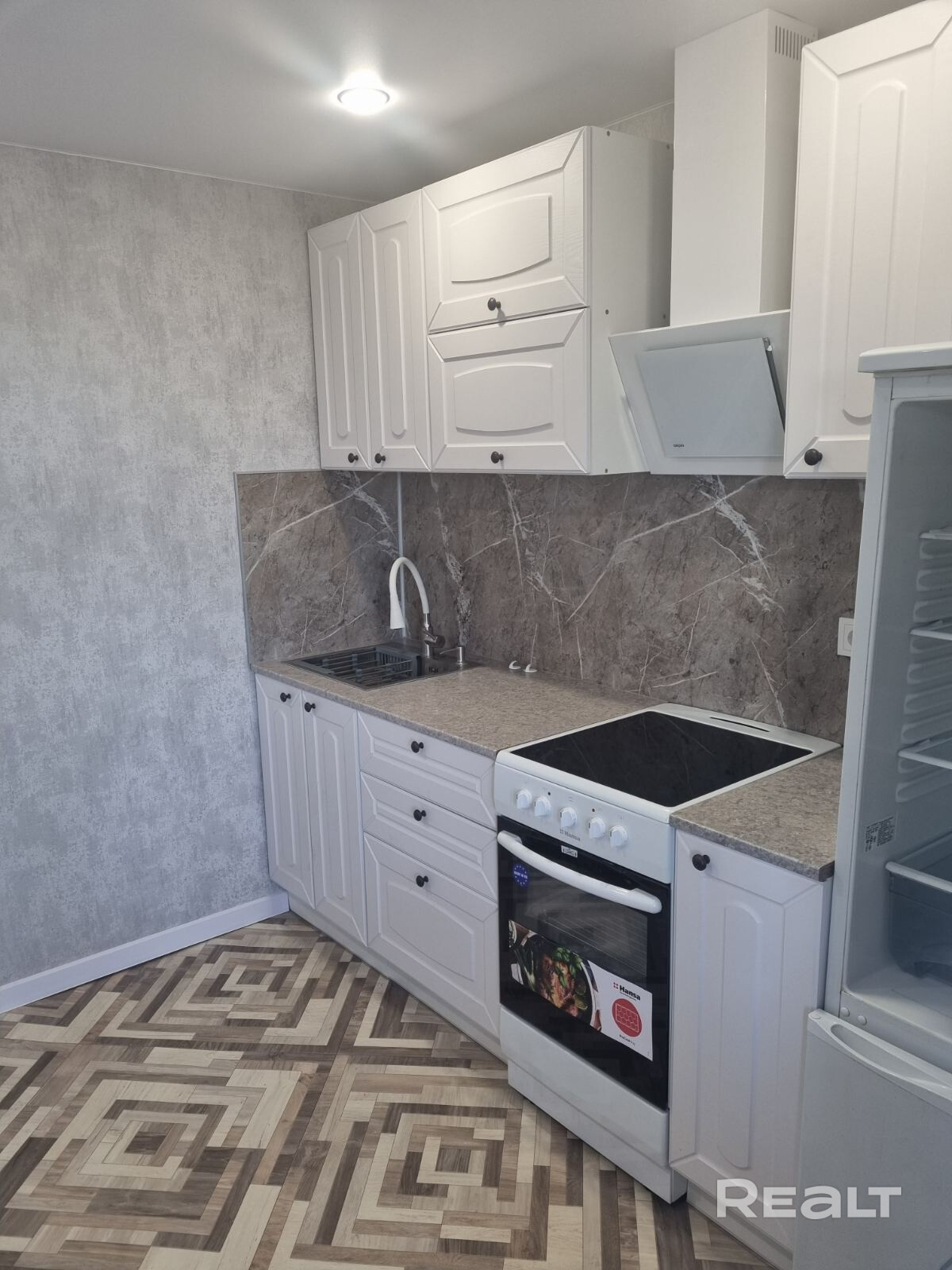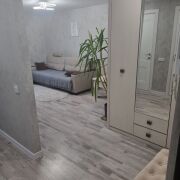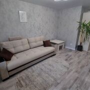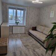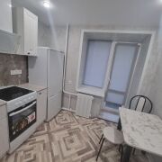 Квартира оборудована всем для комфортного проживания: холодильник, плита, духовой шкаф, стиральная машина, интернет, домофон. Мебель (диван, большой шкаф, комод с вешалкой, стол и стулья). На полу в комнате ламинат.