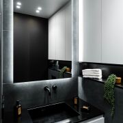 Сан. узел: корпусная мебель, зеркало с подсветкой, полотенцесушитель и душевая кабина.