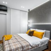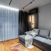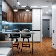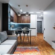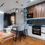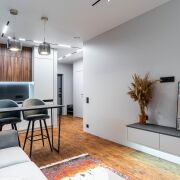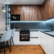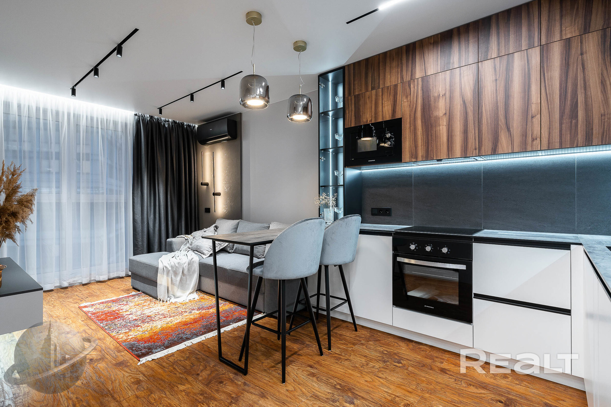 Из бытовой техники: 2 кондиционера, телевизор (нет на фото), холодильник, СВЧ-печь, духовой шкаф, индукционная панель, стиральная машина, посудомойка.