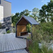 Ландшафтный дизайн территории дома, красивые беседки и скамейки для отдыха жильцов дома.