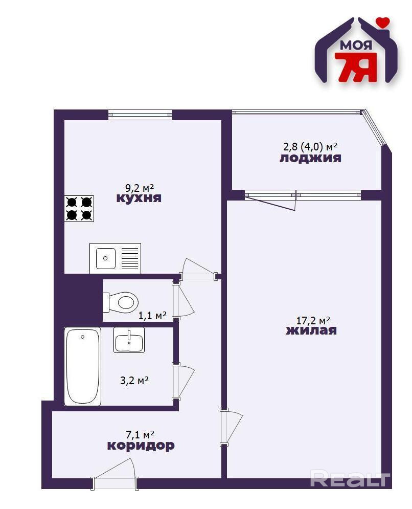 - Общая площадь составляет 40,6 м2, жилая - 17,2 м2. Кухня - 9,2 кв.м.