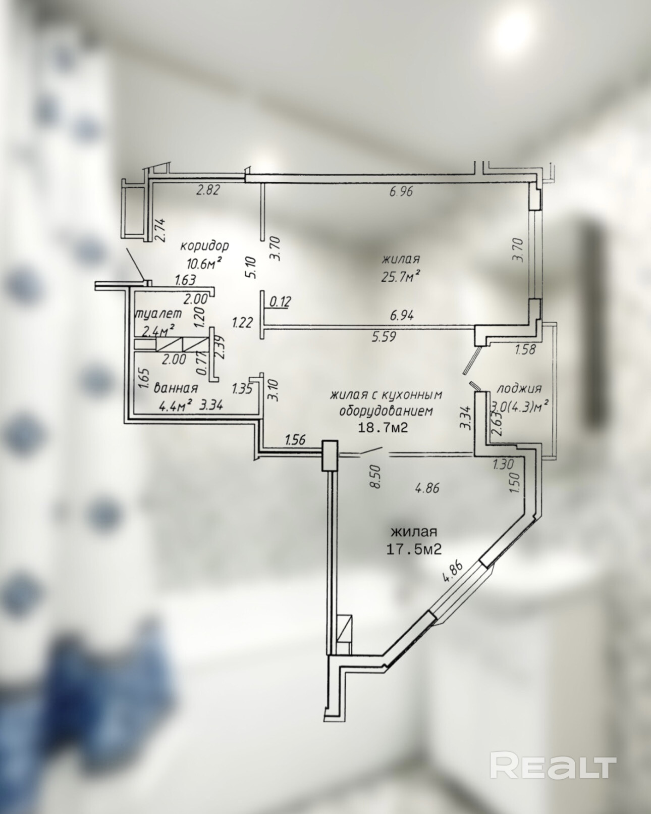 Квартира с двумя отдельными жилыми комнатами (25,7 м2 и 17,5 м2) и просторной кухней-гостиной (18,7 м2) с выходом на лоджию.