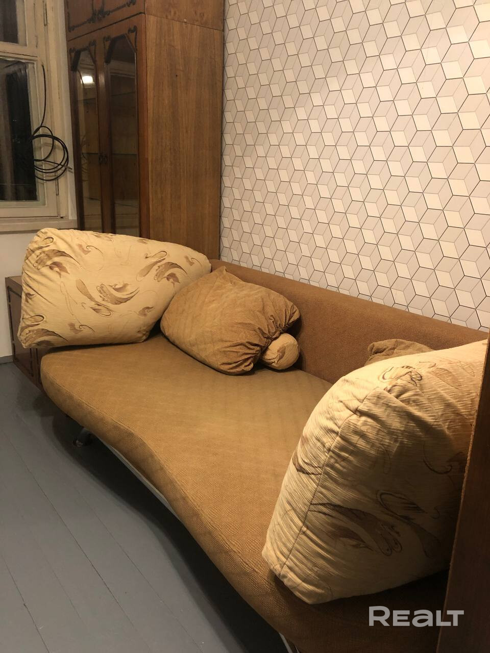 Квартира теплая и в аккуратном состоянии: деревянный пол, потолок окрашен, на стенах обои.