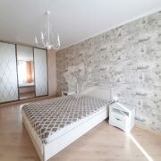 Уютная спальня: большая двуспальная кровать, вместительный шкаф-купе во всю стену и комод для хранения вещей.