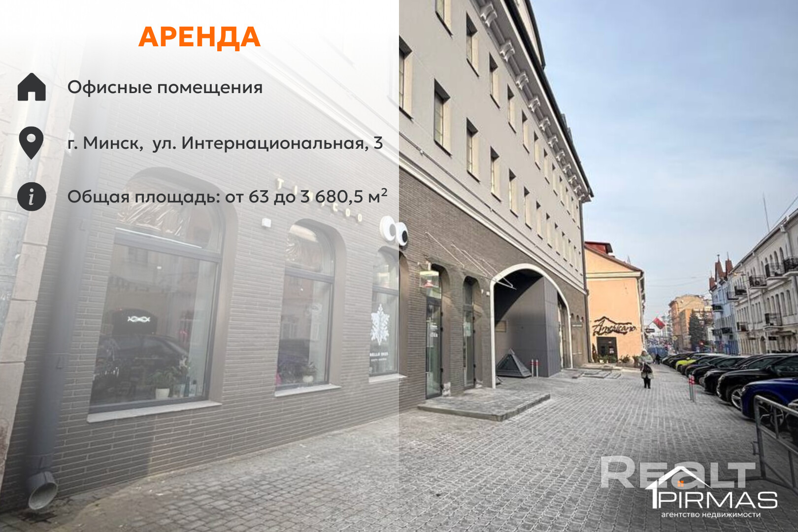 Предлагаем в аренду офисные помещения от 63 м² до 3 680,5 м² в центре Минска по ул. Интернациональная, 3. Здание после реконструкции 2023 года, современные коммуникации, круглосуточный доступ, парковка. Рядом метро «Немига», развитая инфраструктура, исторические и культурные объекты. Идеально для офисов, салонов, медицинских центров и др. Свяжитесь с нами для просмотра и обсуждения условий аренды.