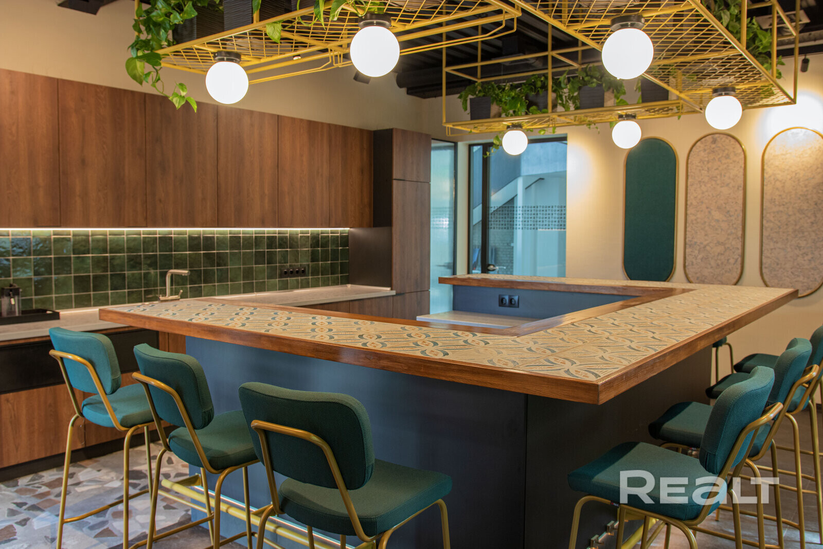- просторная кухня с барными сидениями, подведенными коммуникациями и большими окнами (сиди, кушай, думай о работе)