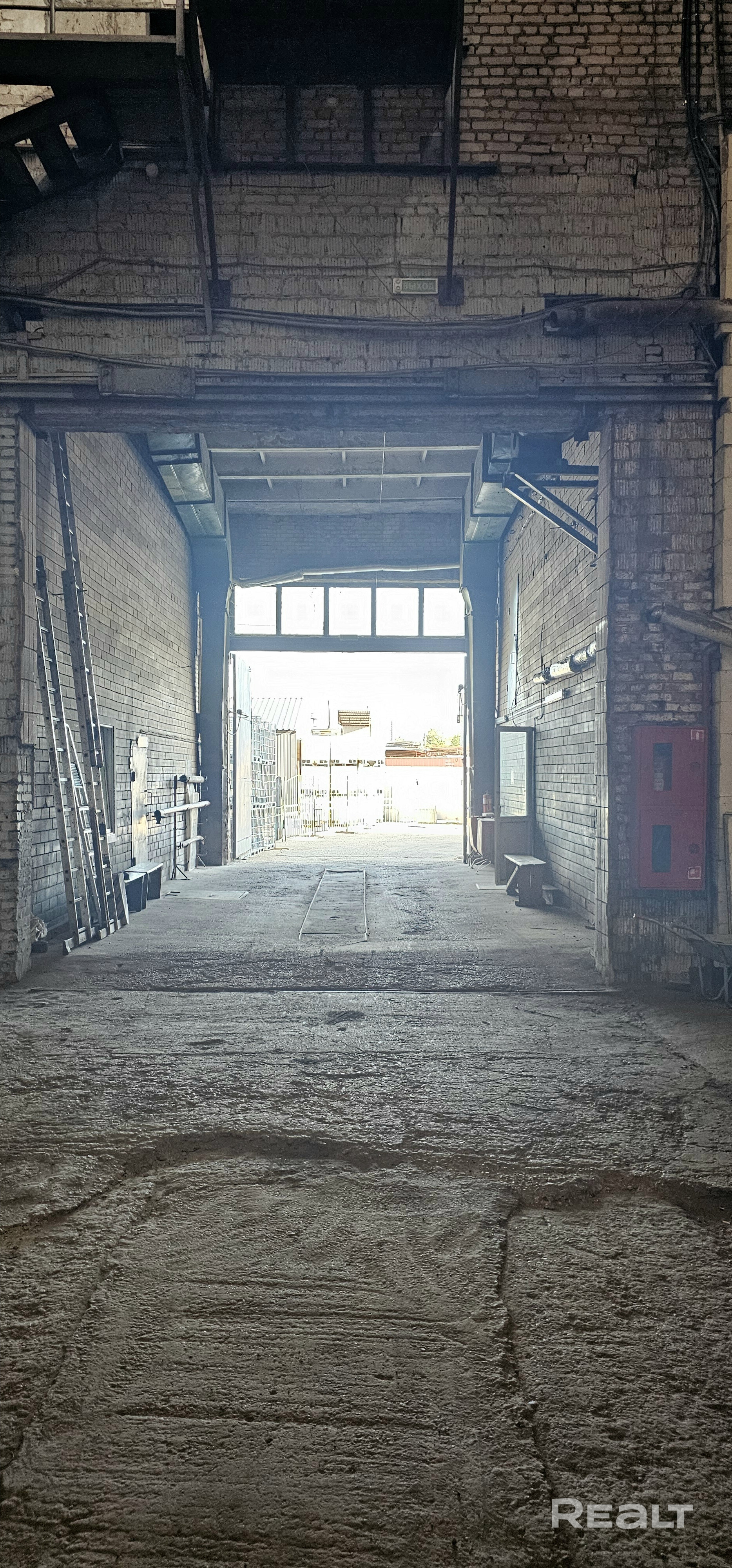 Часть помещения для производства. Высота потолка --11м. Кран -балка. Вход для персонала отдельный, вьезд общий.