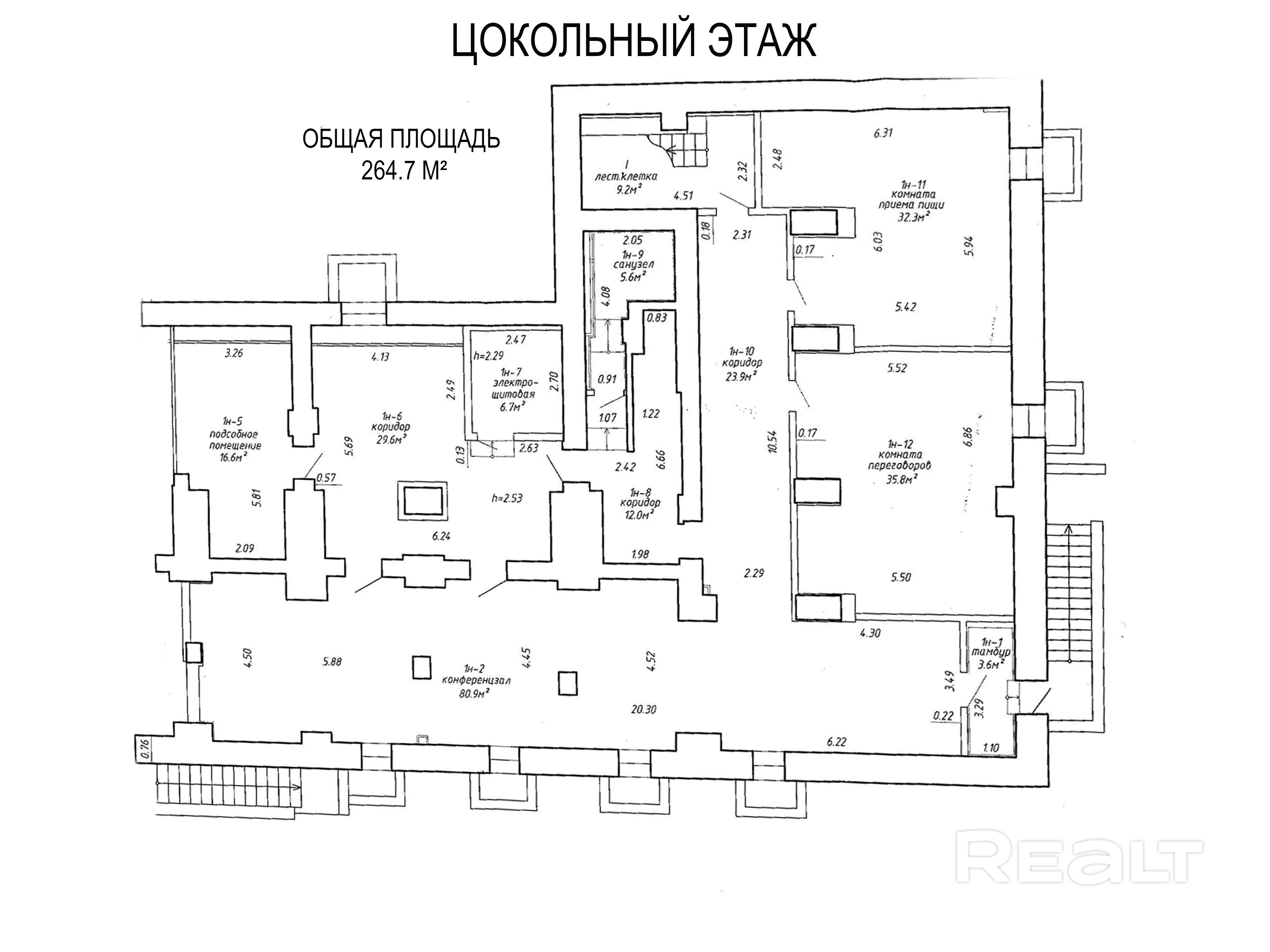 Предлагаемые площади: Цокольный этаж: 264.7 кв.м
