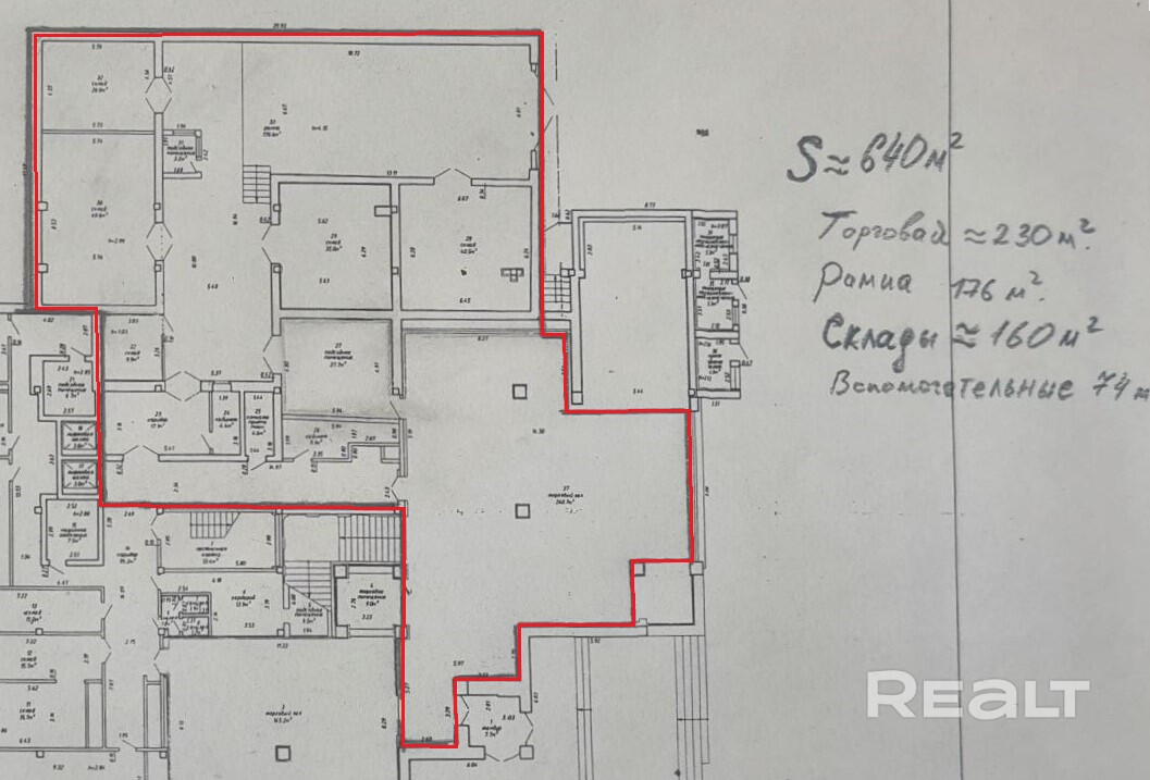 1-й этаж – 640 м2 (торговое - 230 м2, рампа - 176 м2, склады - 160 м2, вспомогательные - 74 м2);