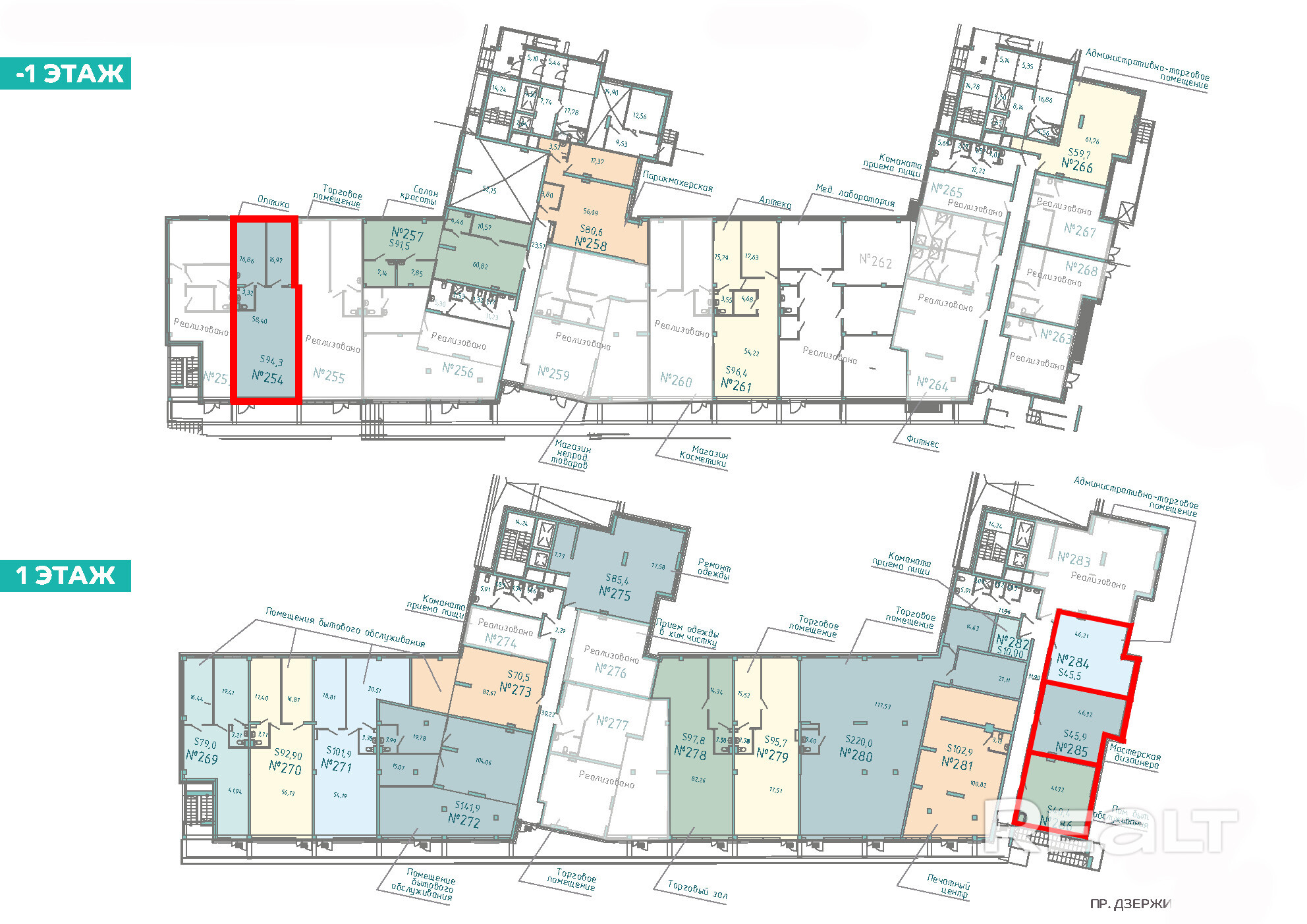Торговые помещения площадью: 94,3 м2; 45,5 м2; 45,9 м2; 40,4 м2.