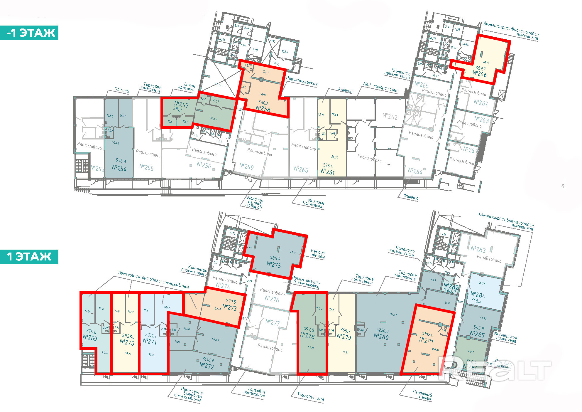 Торговые помещения площадью: 91,5 м2; 80,6 м2; 59,7 м2; 79 м2; 92,9 м2; 101,9 м2; 70,5 м2; 85,4 м2; 97,8 м2; 102,9 м2.